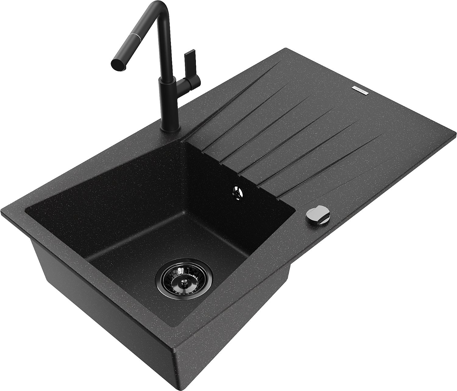 Mexen Cesar 1-medencés gránit mosogató csepegtetővel és Flora konyhai csapteleppel, fekete/ezüst metál - 6514-73-670401-70-B