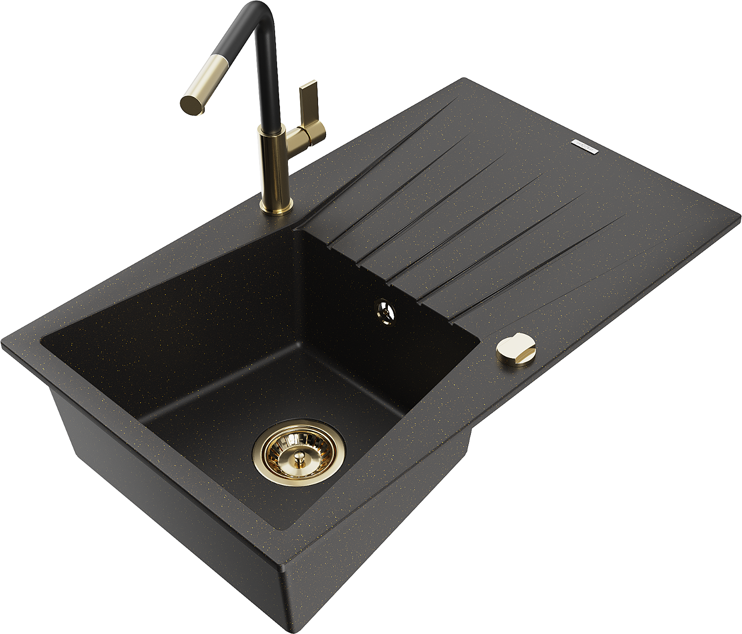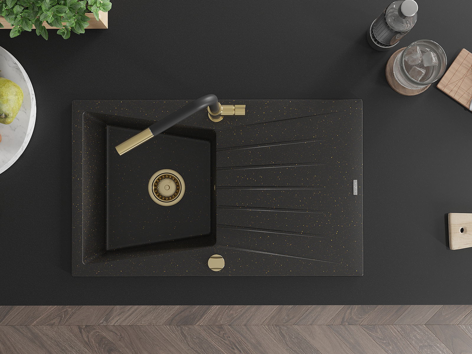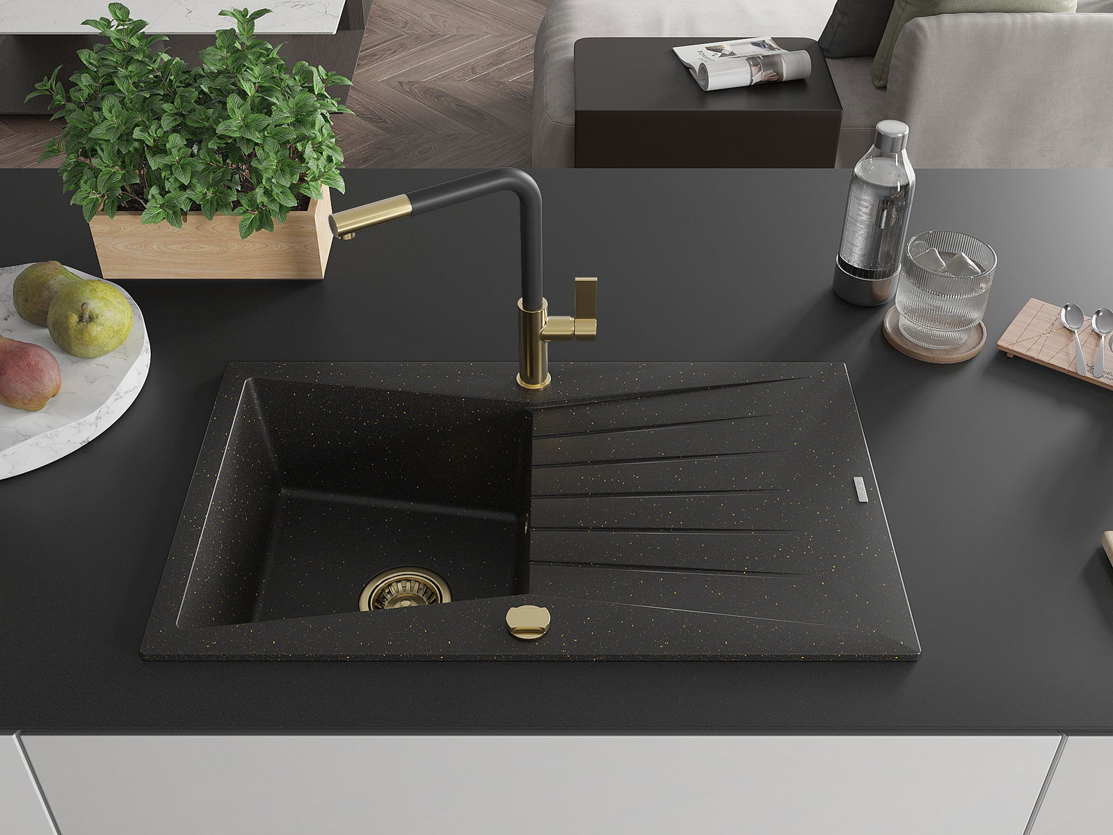Mexen Cesar egymedencés gránit mosogató csepegtetővel és Flora konyhai csapteleppel, fekete/arany metál - 6514-75-670401-57-G