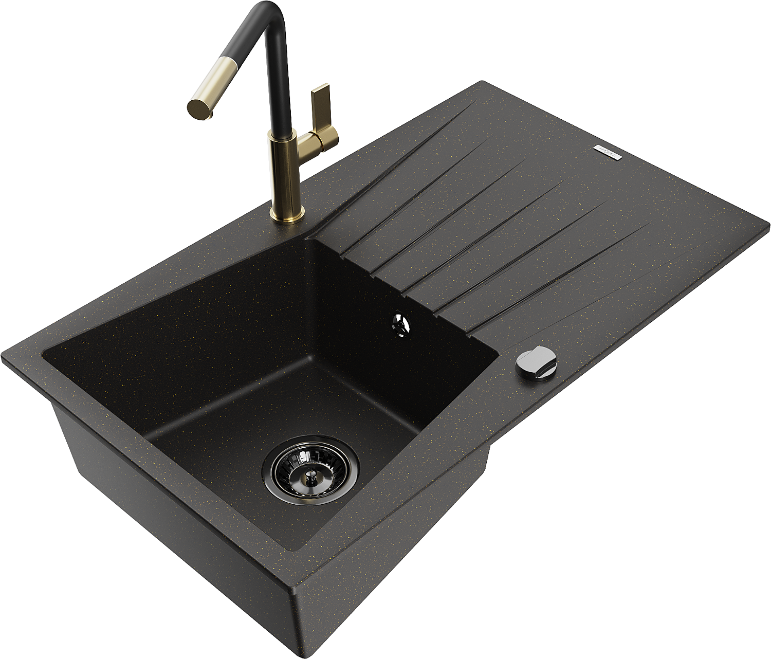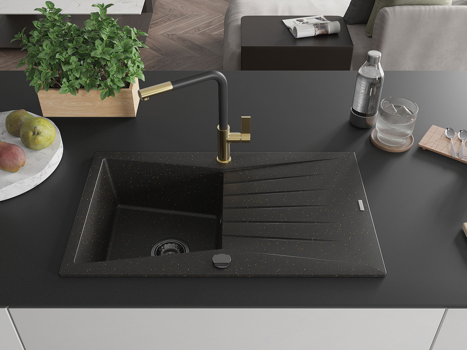 Mexen Cesar egymedencés gránit mosogató csepegtetővel és Flora konyhai csapteleppel, fekete/arany metál - 6514-75-670401-57-B
