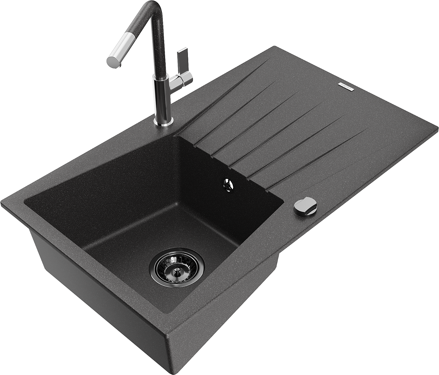 Mexen Cesar gránit mosogató 1-medencés csepegtetővel és Flora konyhai csapteleppel, fekete pöttyös - 6514-76-670401-08-B