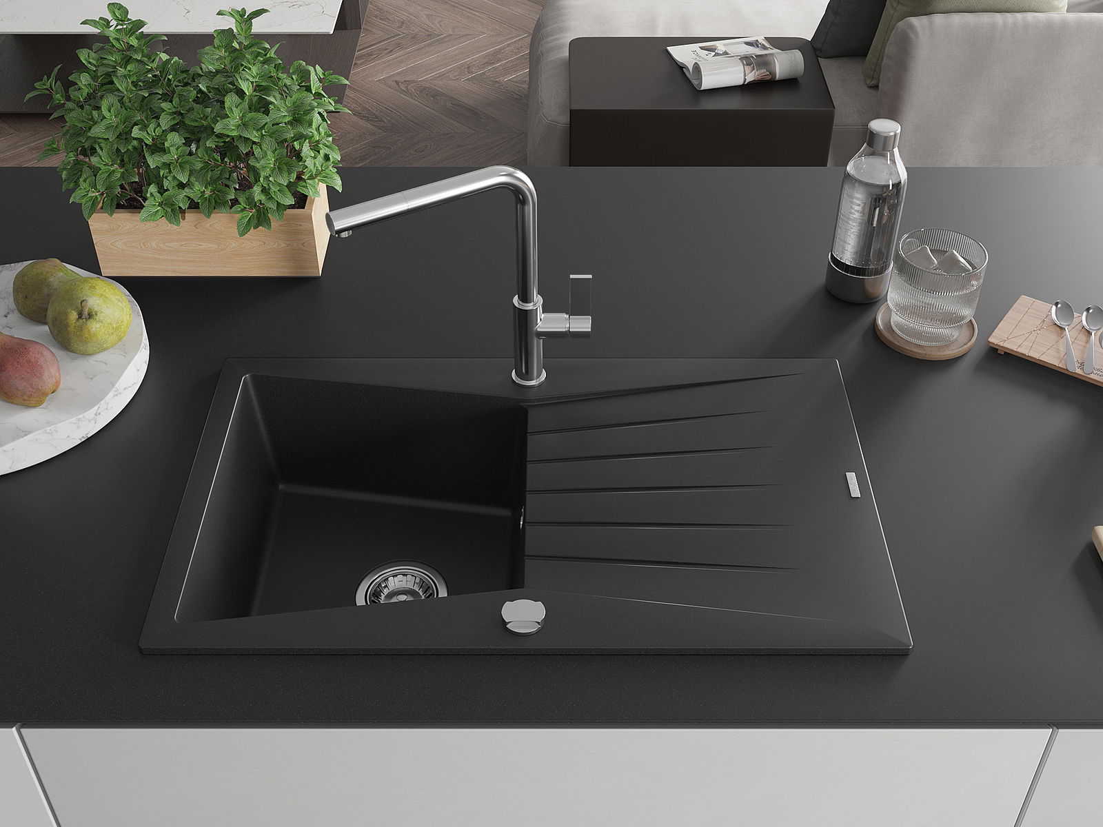 A mosogató magas minőségű gránitból készült. Elegáns, de mindenekelőtt praktikus kiegészítője minden konyhának, függetlenül annak stílusától. A gránit magas minősége és tartóssága hosszú távú használatot biztosít.