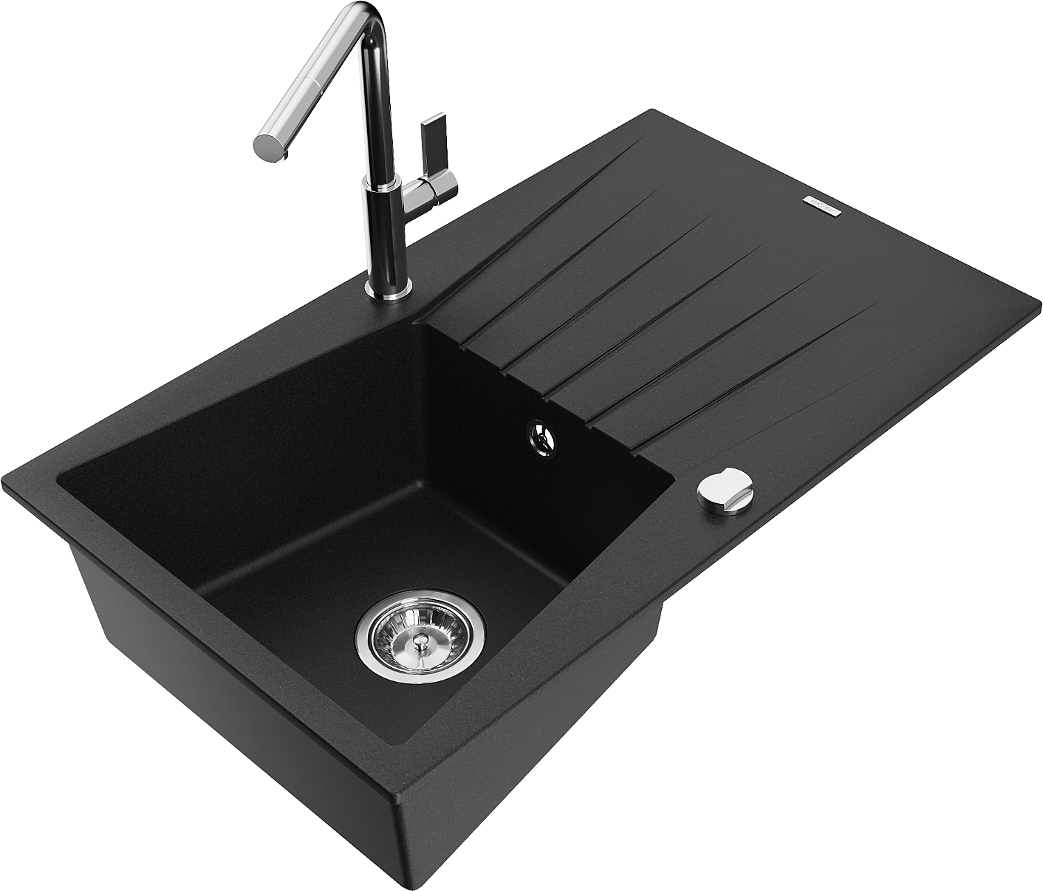 Mexen Cesar gránit mosogató 1-medencés csepegtetővel és Flora konyhai csapteleppel, fekete - 6514-77-670401-00