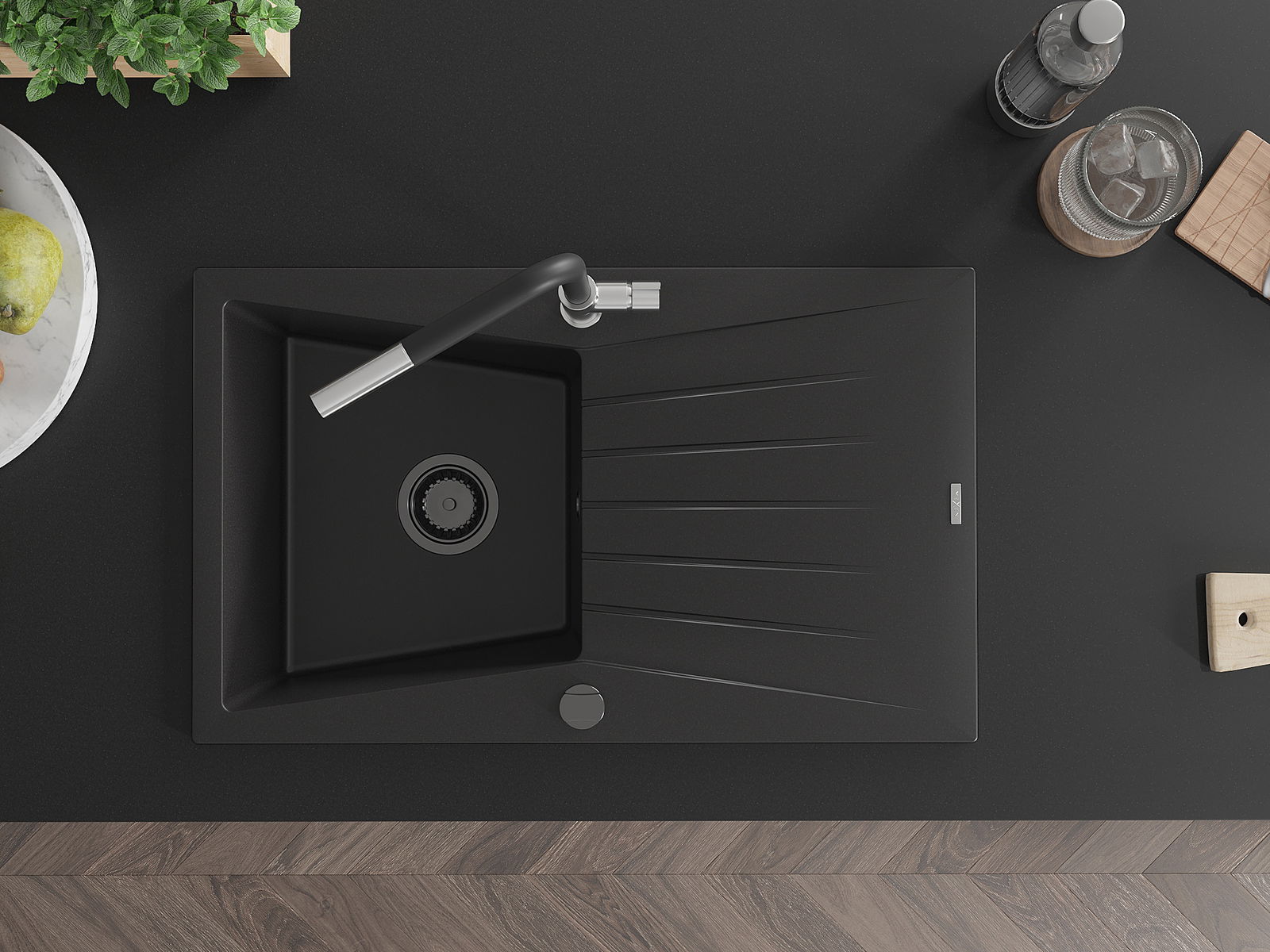 Mexen Cesar 1-medencés gránit mosogató csepegtetővel és Flora konyhai csapteleppel, fekete - 6514-77-670401-07-B