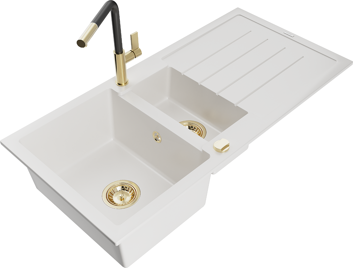 Mexen Andres 1,5-medencés gránit mosogató csepegtetővel és Flora konyhai csapteleppel, fehér - 6515-20-670401-57-G