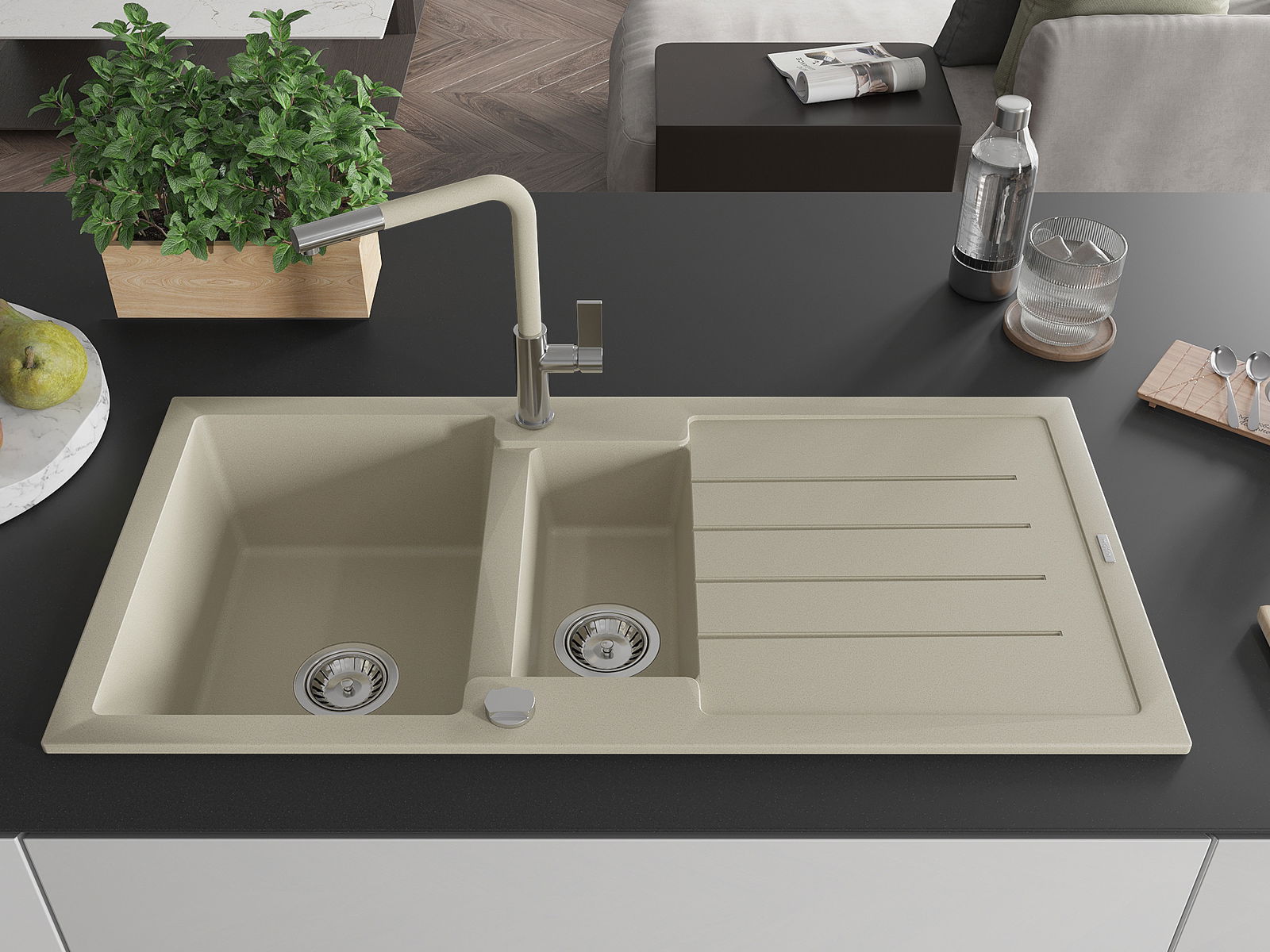 A mosogató felülete ellenáll a foltoknak és a elszíneződésnek, amelynek köszönhetően könnyű megtisztítani és hosszú ideig megtartja színét. Esztétikai és gyakorlatilag kiegészítve minden konyhát.