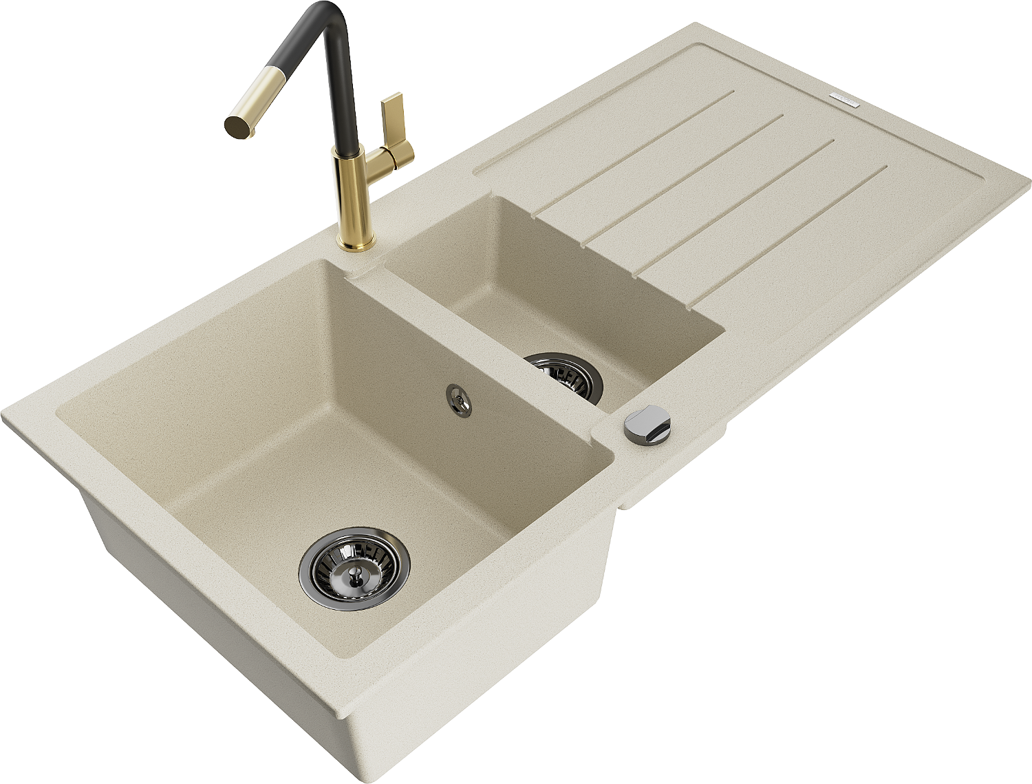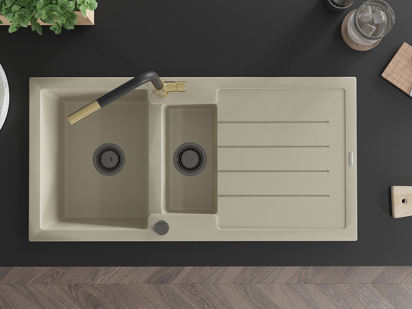 Mexen Andres 1,5-medencés gránit mosogató csepegtetővel és Flora konyhai csapteleppel, bézs - 6515-69-670401-57-B