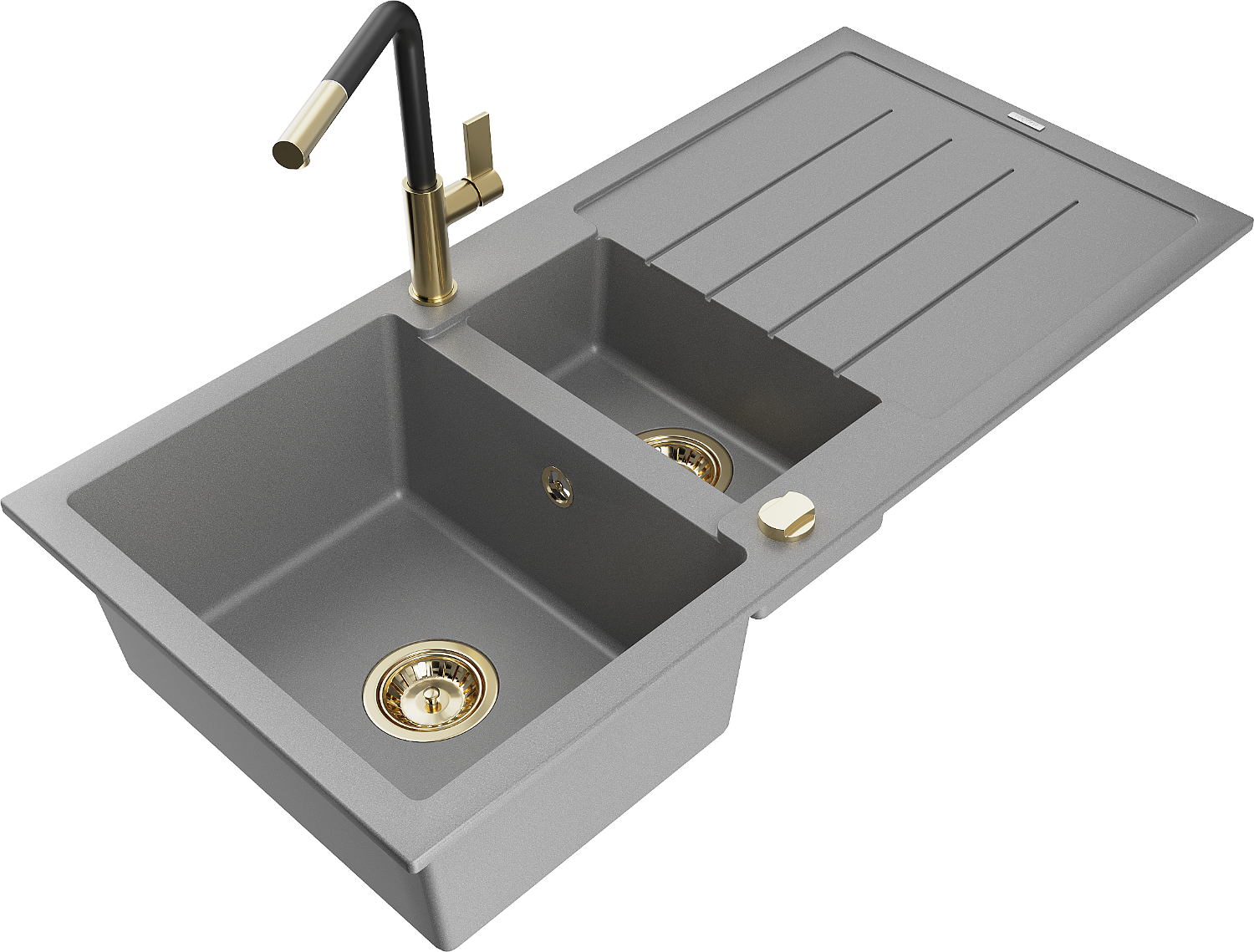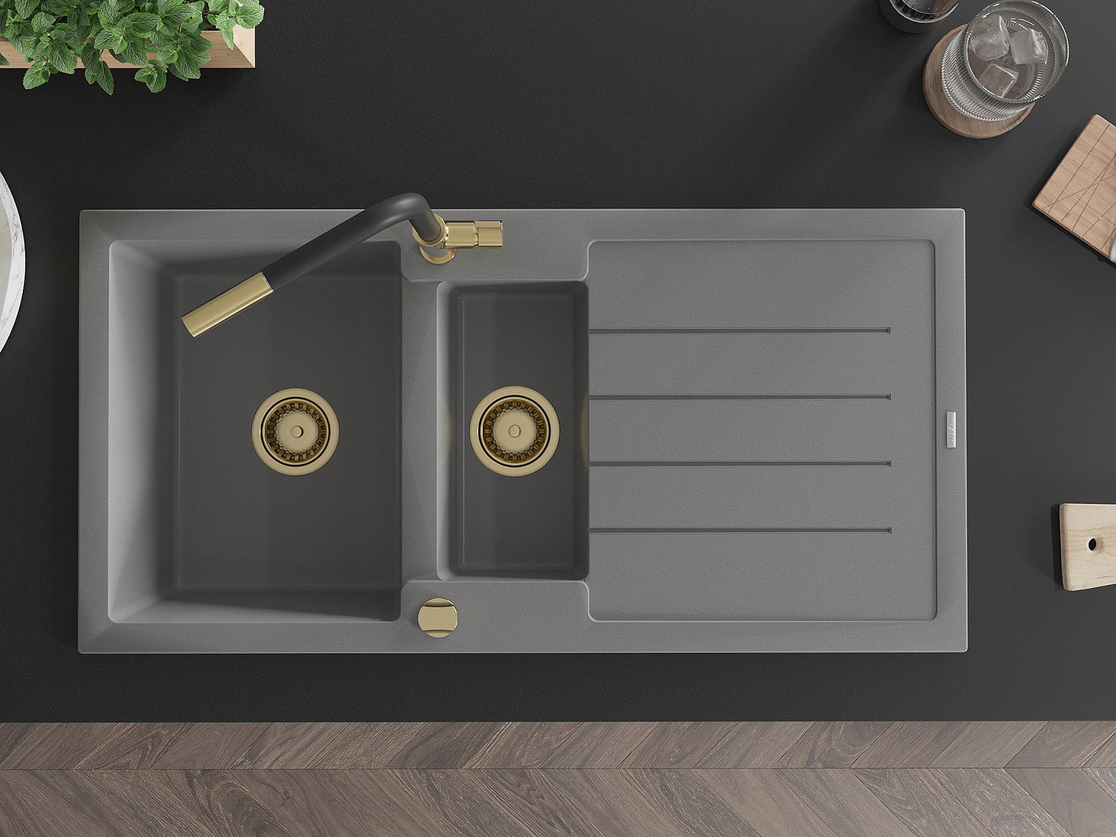 Mexen Andres gránit mosogatótálca 1,5 rekeszes, csepegtetővel és Flora konyhai csappal, szürke - 6515-71-670401-57-G