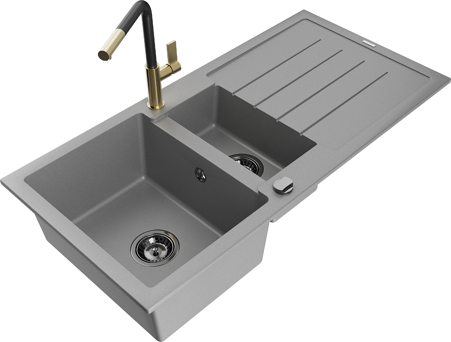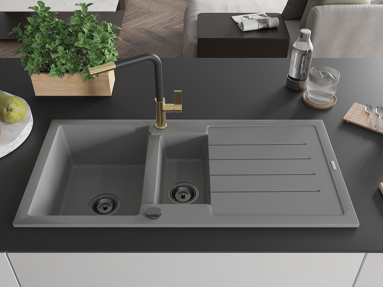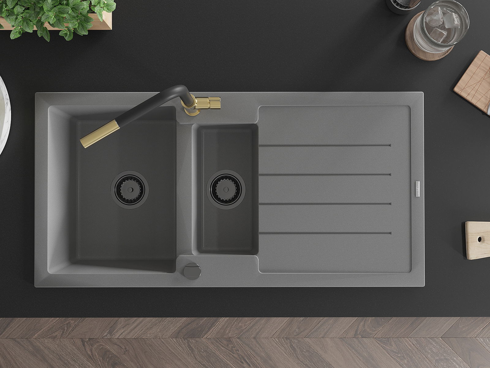 Mexen Andres 1,5-medencés gránit mosogató elvezetővel és Flora konyhai csapteleppel, szürke - 6515-71-670401-57-B