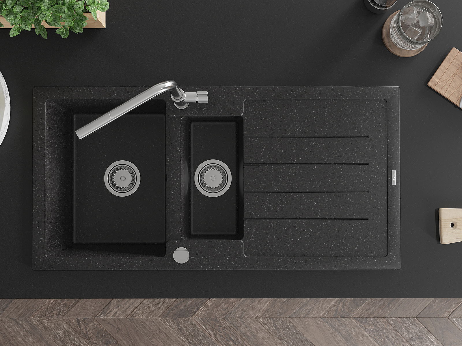 Mexen Andres gránit mosogató 1,5-medencés csepegtetővel és Flora konyhai csapteleppel, fekete/ezüst - 6515-73-670401-00