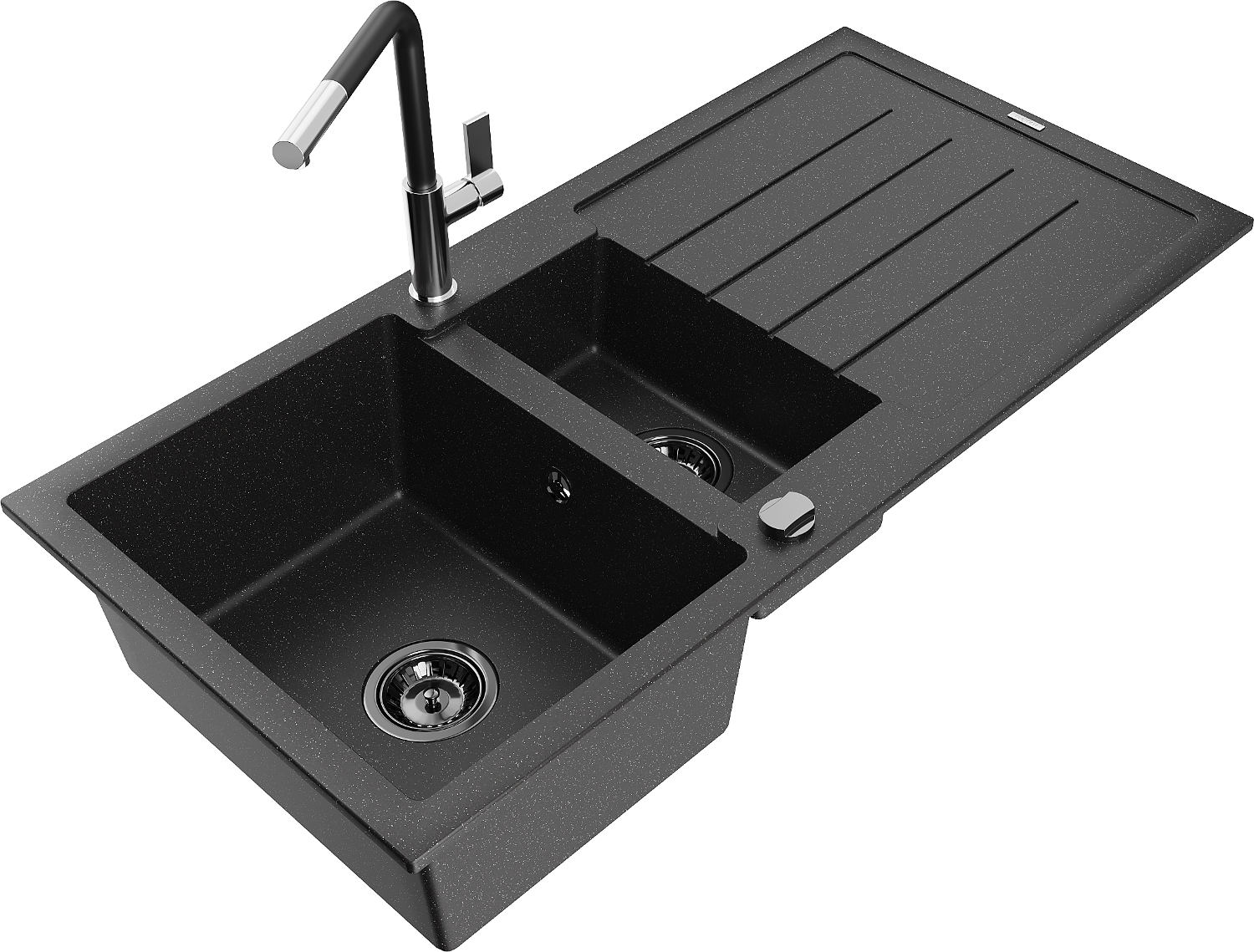 Mexen Andres gránit mosogató 1,5 rekeszes csepegtetővel és Flora konyhai csapteleppel, fekete/ezüst - 6515-73-670401-07-B