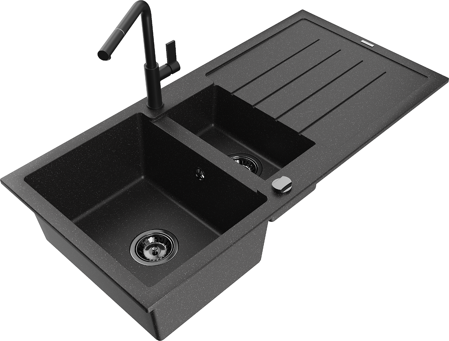 Mexen Andres 1,5 medencés gránit mosogató csepegtetővel és Flora konyhai csapteleppel, fekete/ezüst - 6515-73-670401-70-B
