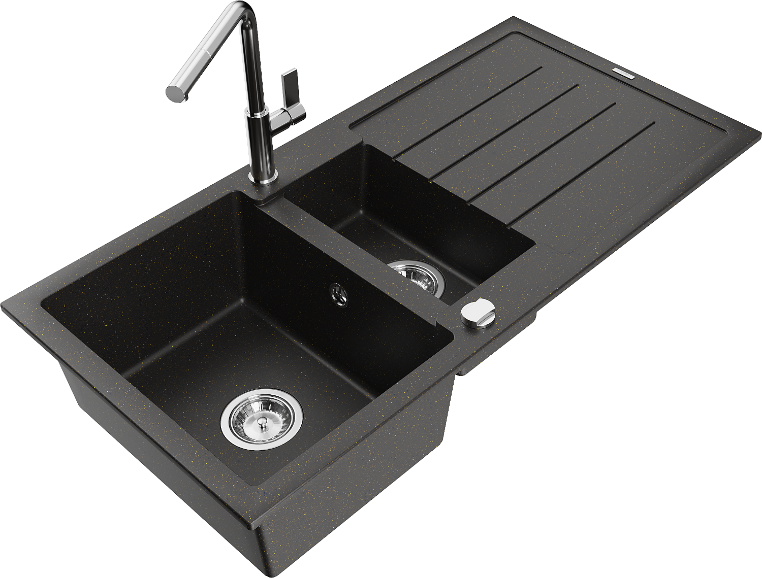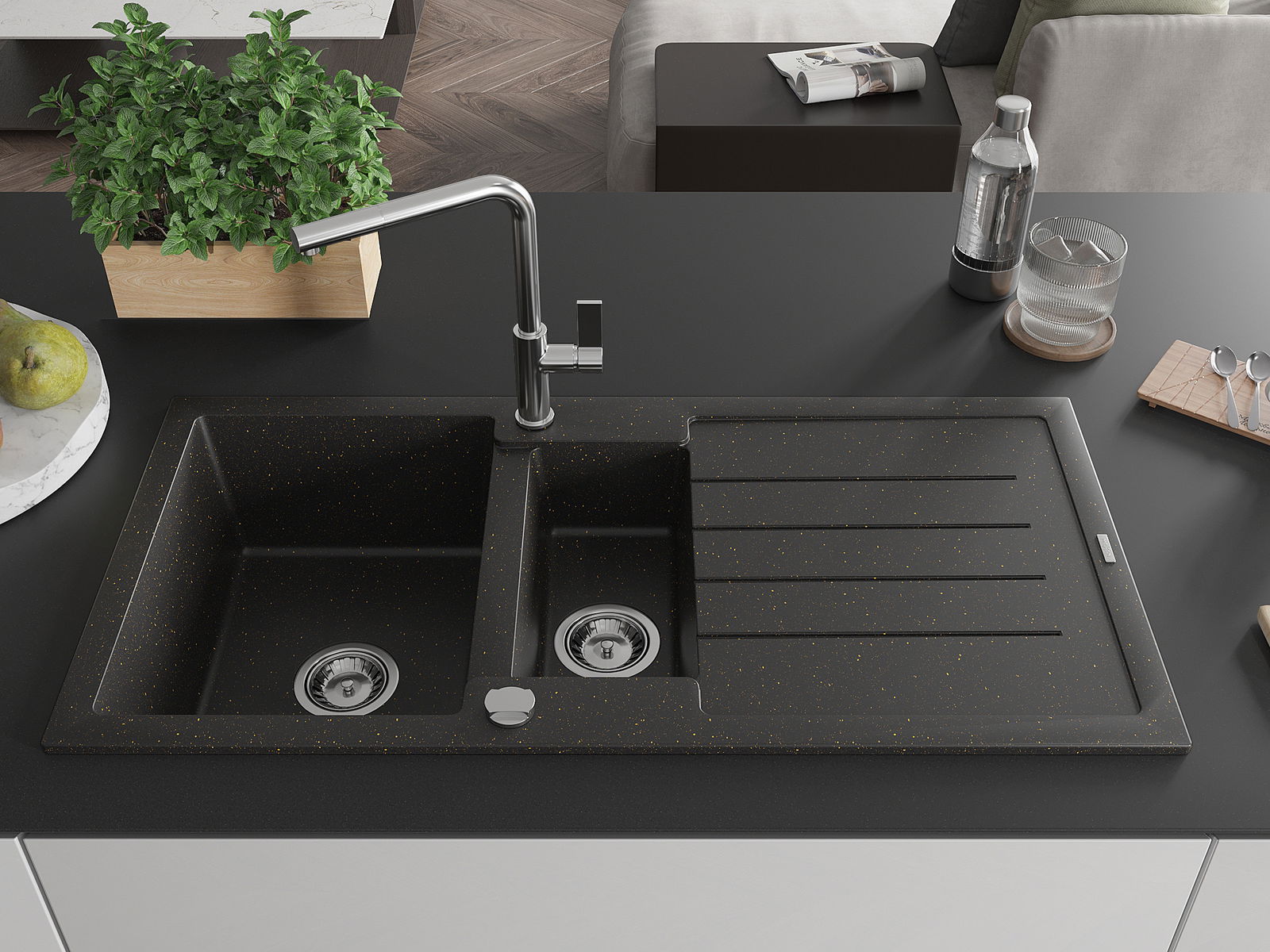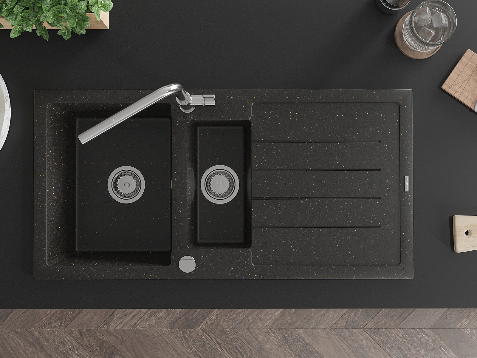 Mexen Andres gránit mosogató 1,5 medencével, leeresztővel és Flora konyhai csappal, fekete/arany metál - 6515-75-670401-00