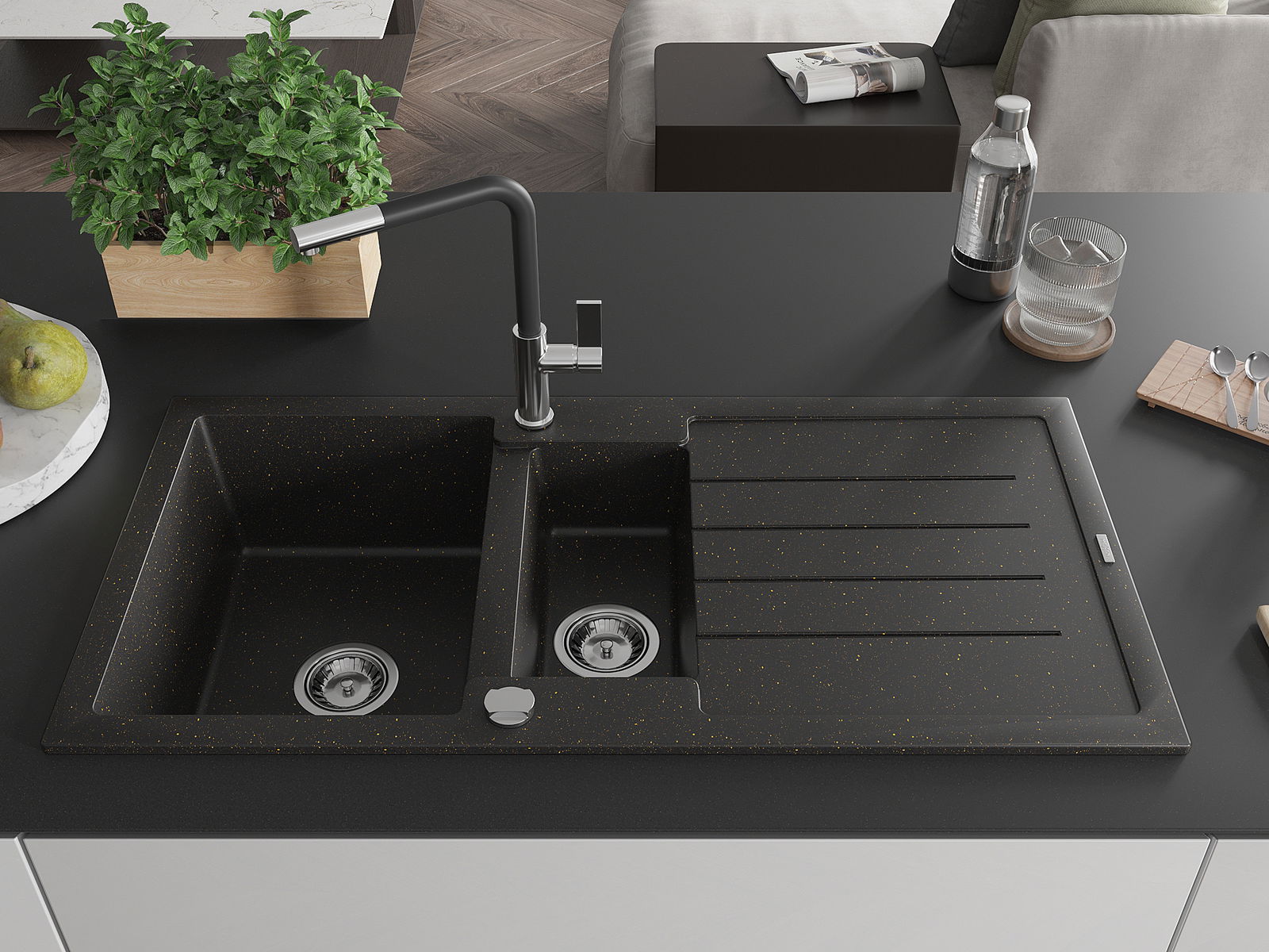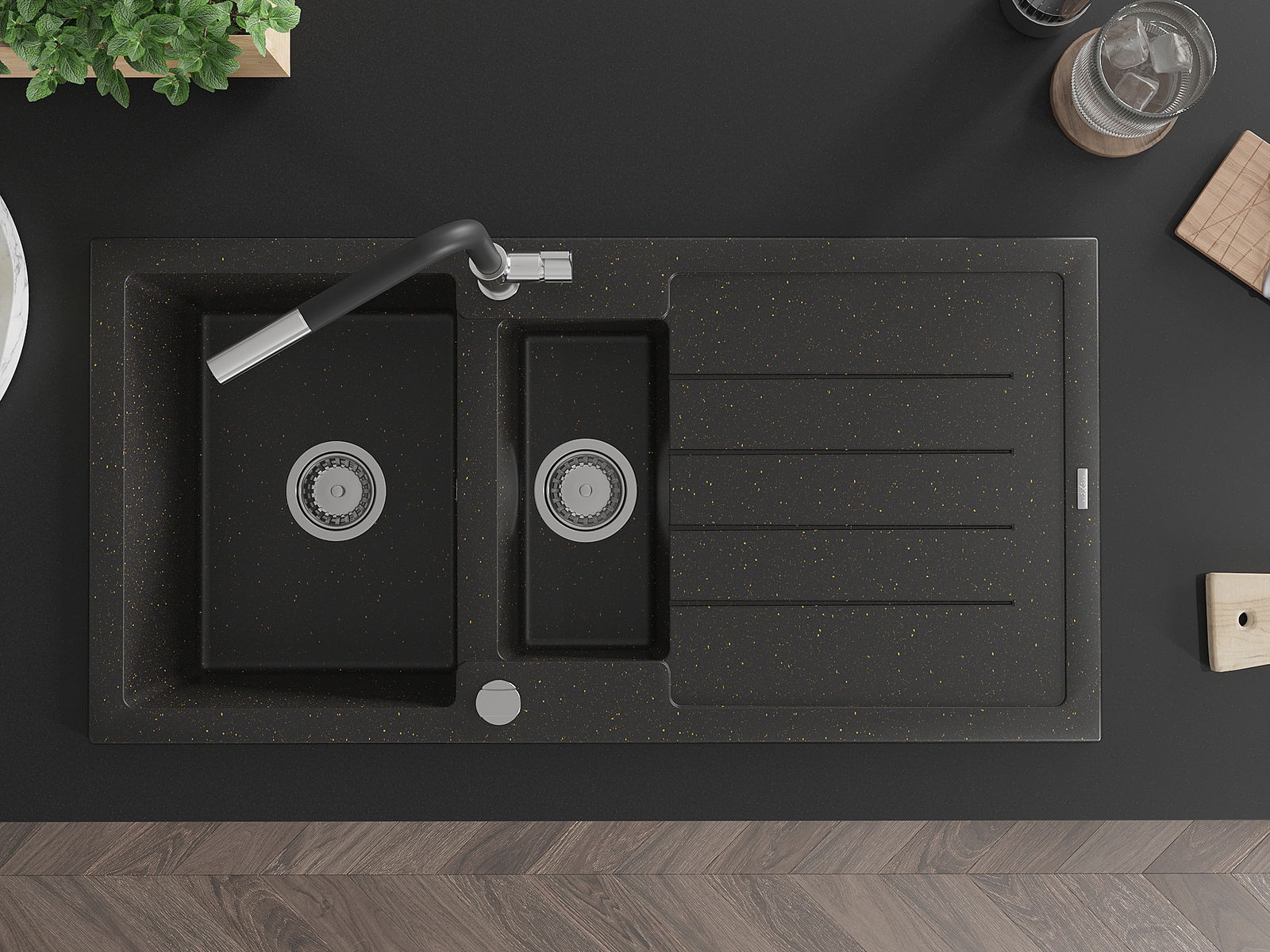 Mexen Andres gránit mosogató 1,5 medencés csöpögtetővel és Flora konyhai csapteleppel, fekete/arany metál - 6515-75-670401-07