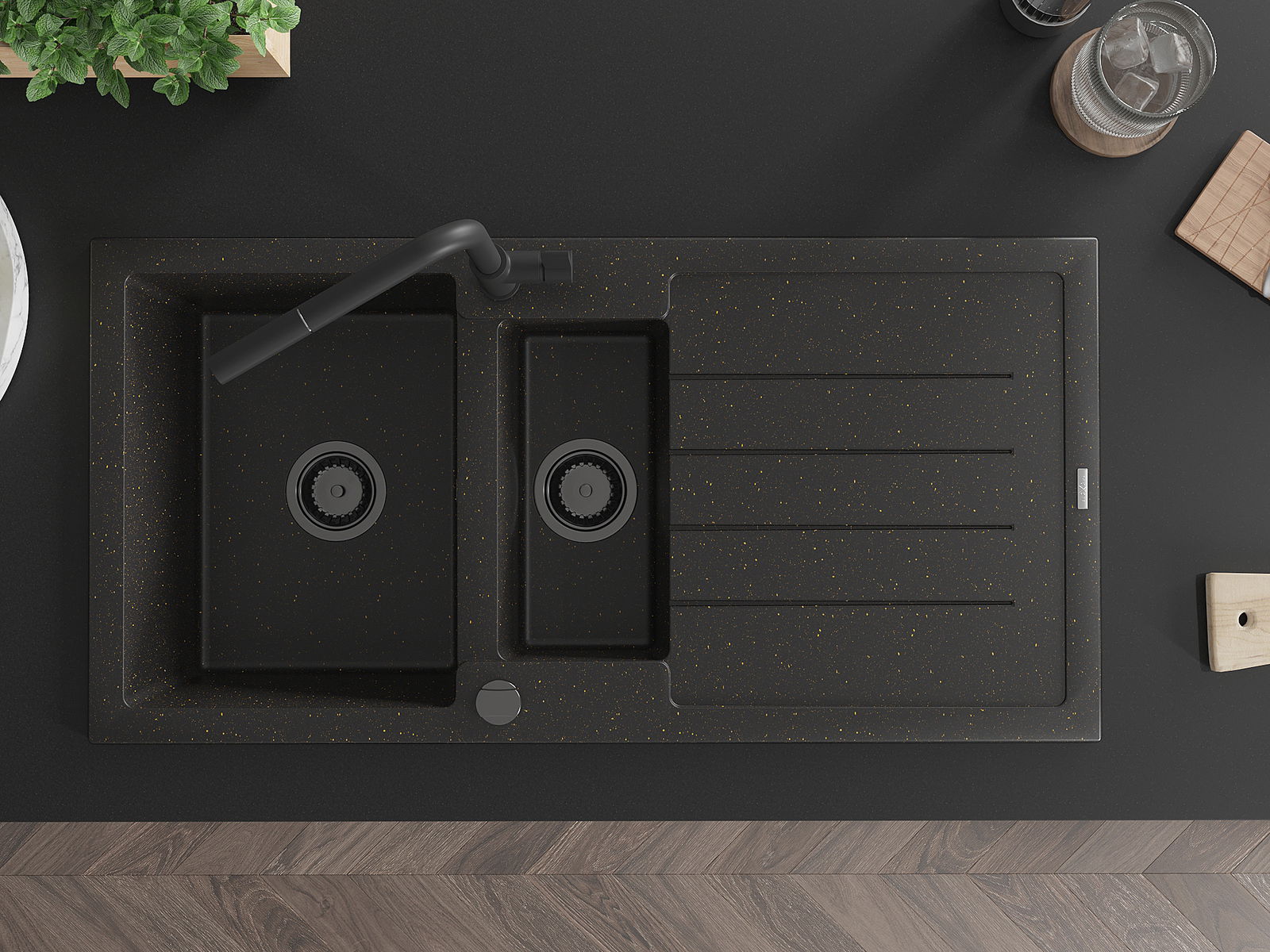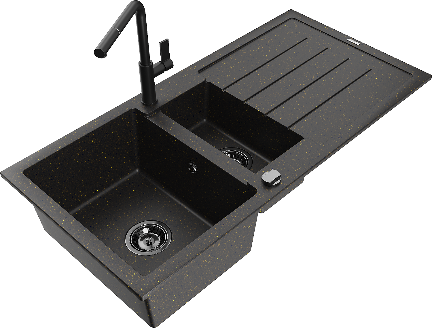Mexen Andres 1,5 rekeszes gránit mosogató csepegtetővel és Flora konyhai csapteleppel, fekete/arany - 6515-75-670401-70-B