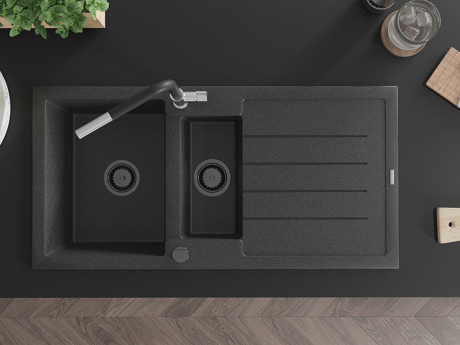 Mexen Andres gránit mosogató 1,5 rekeszes csepegtetővel és Flora konyhai csapteleppel, fekete pöttyös - 6515-76-670401-07-B