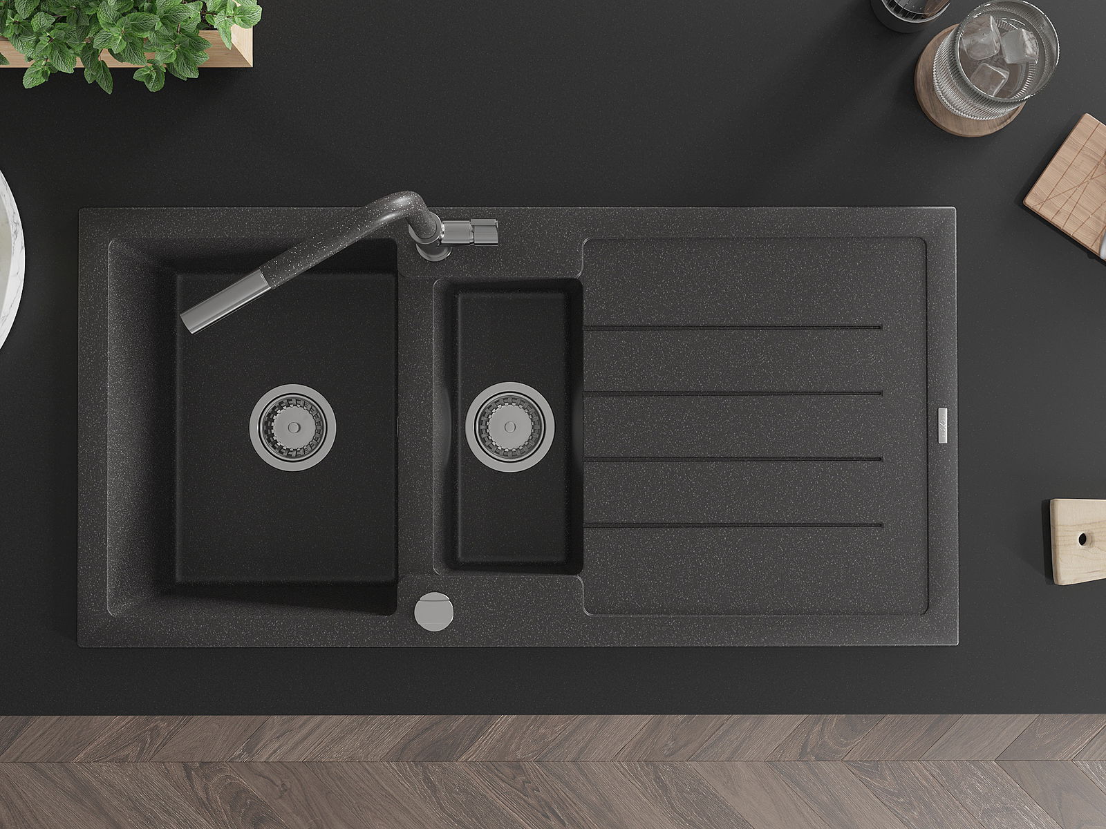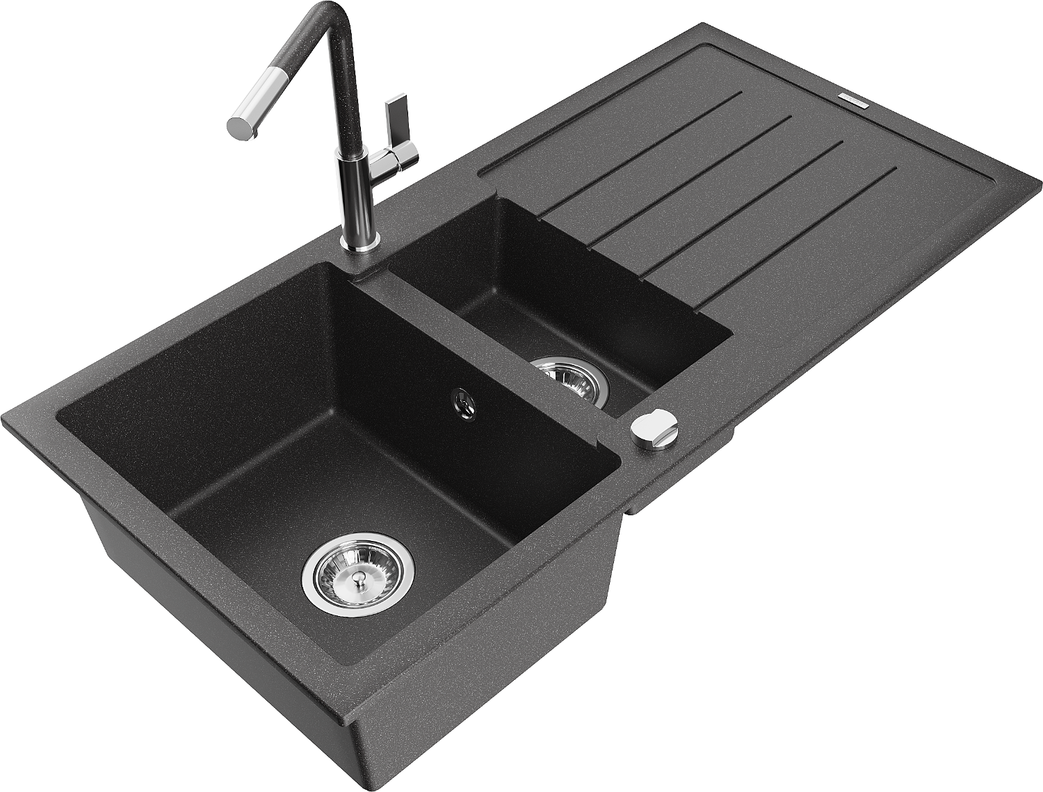 Mexen Andres 1,5-medencés gránit mosogató lefolyóval és Flora konyhai csappal, fekete szórt - 6515-76-670401-08