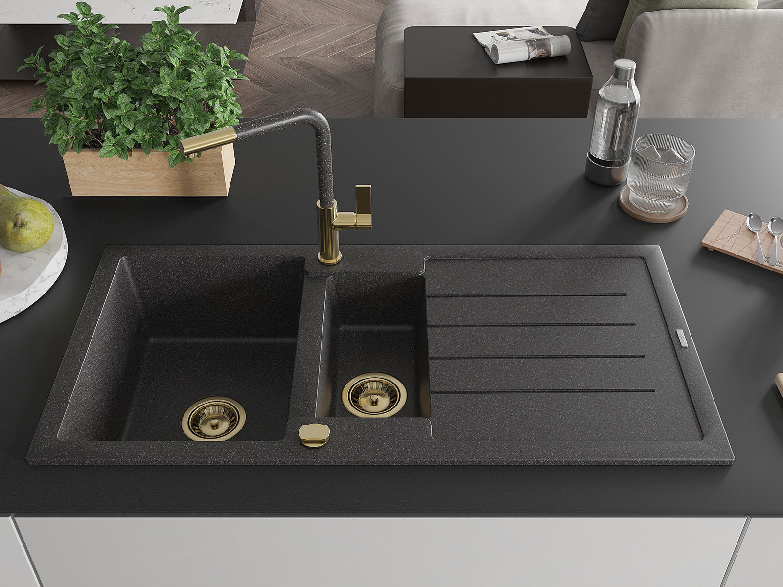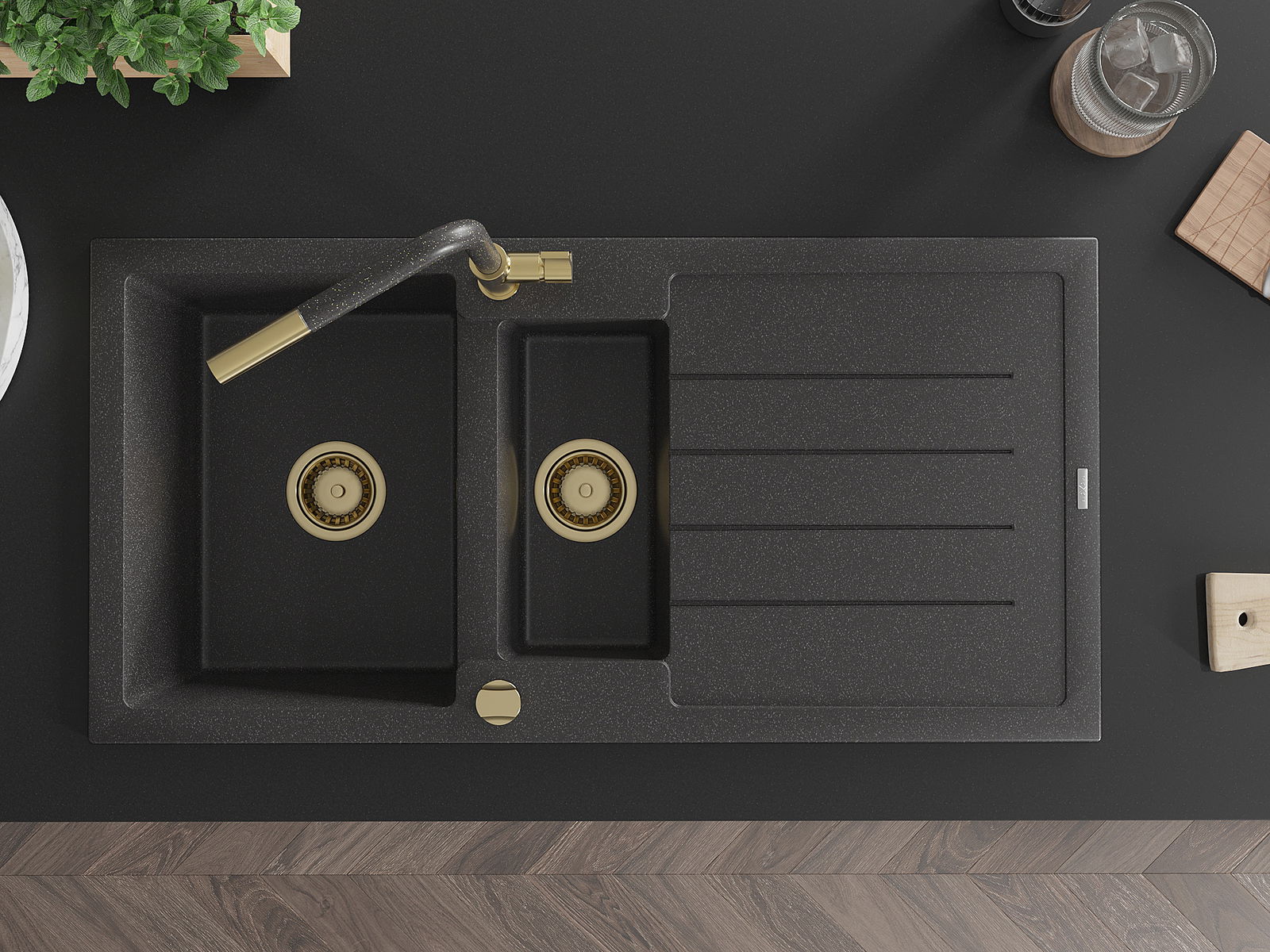 A mosogató 2 összekapcsolt lyukkal rendelkezik, amelynek átmérője 35 mm, önmagában. Felhasználhatók többek között Olyan folyékony adagoló rögzítéséhez, amely kiküszöböli a műanyag palackok jelenlétét a konyhában, és elegáns kivitelben adja meg.