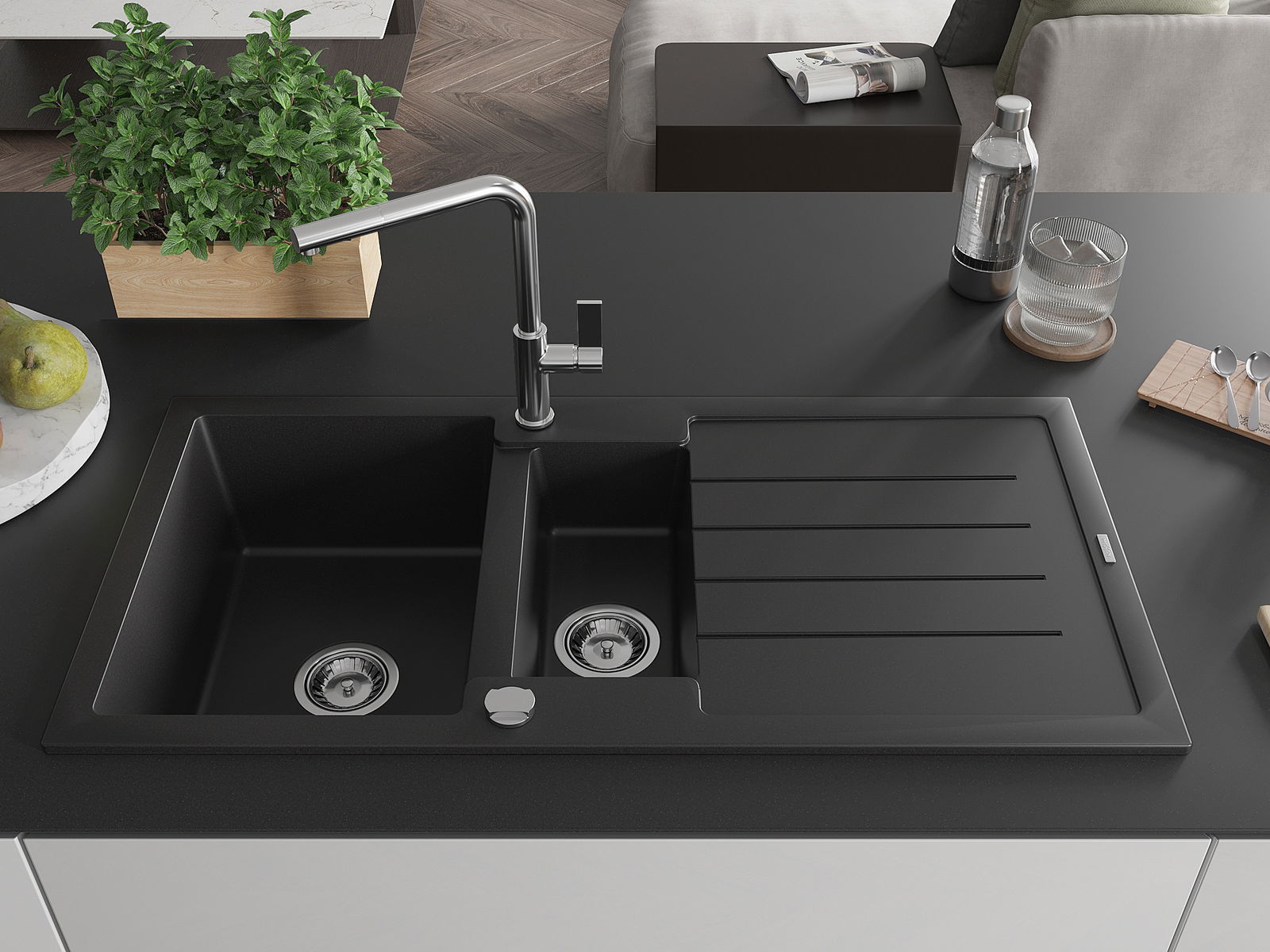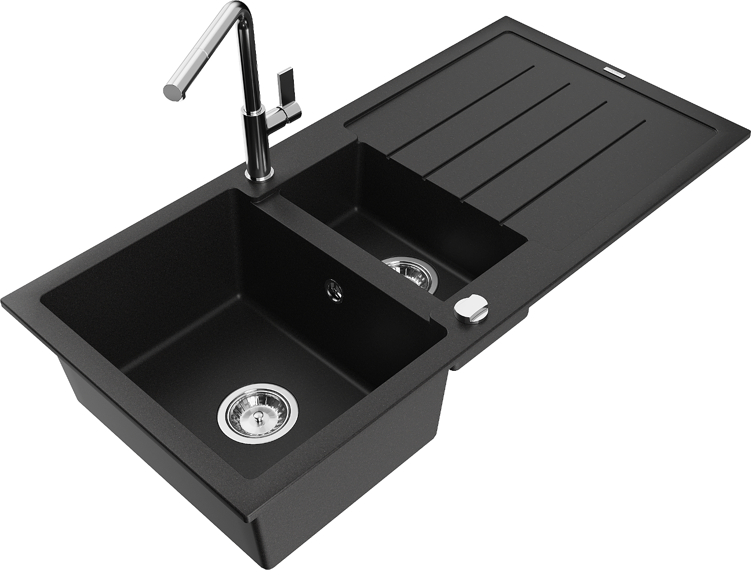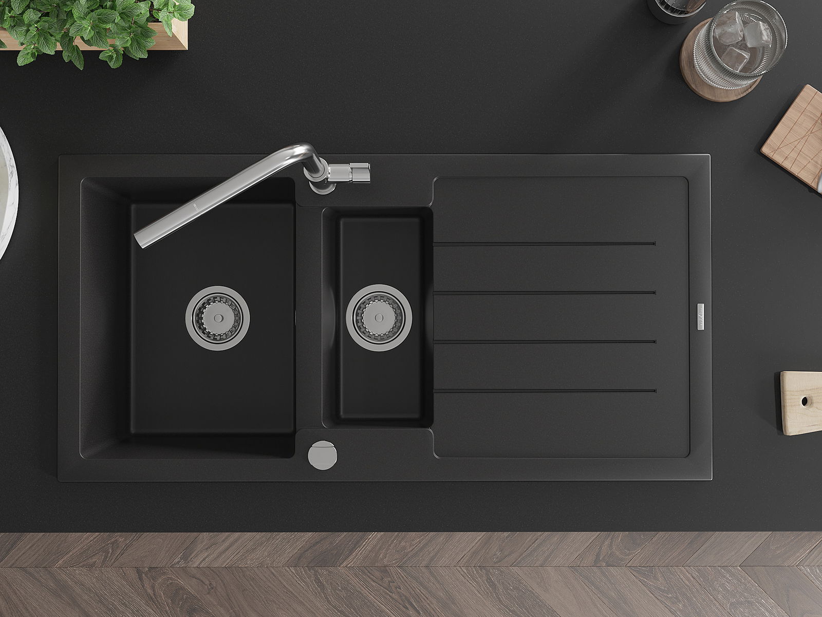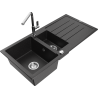 Mexen Andres gránit mosogató 1,5 medencés csepptálcával és Flora konyhai csapteleppel, fekete - 6515-77-670401-00