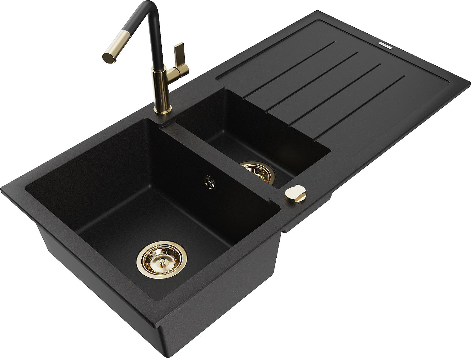 Mexen Andres 1,5 medencés gránit mosogató csepegtetővel és Flora konyhai csapteleppel, fekete - 6515-77-670401-57-G