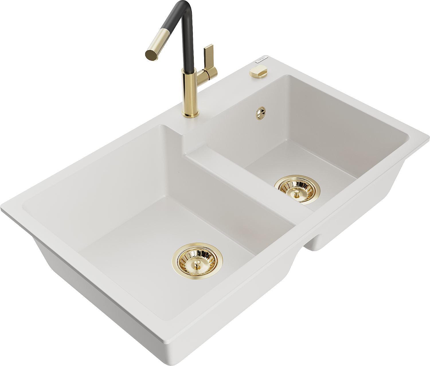 Mexen Tomas gránit mosogató 2-medencés Flora konyhai csappal, fehér - 6516-20-670401-57-G