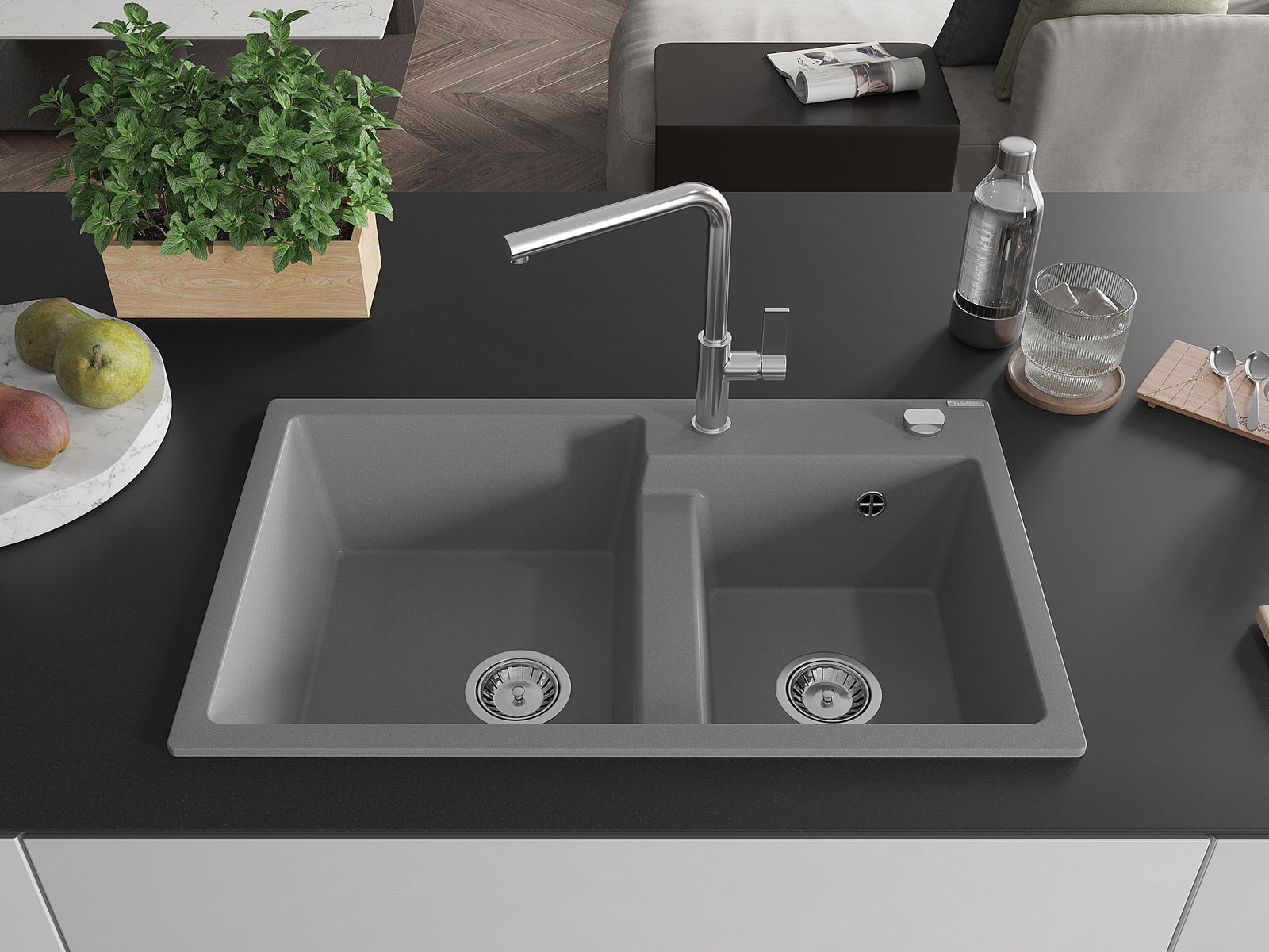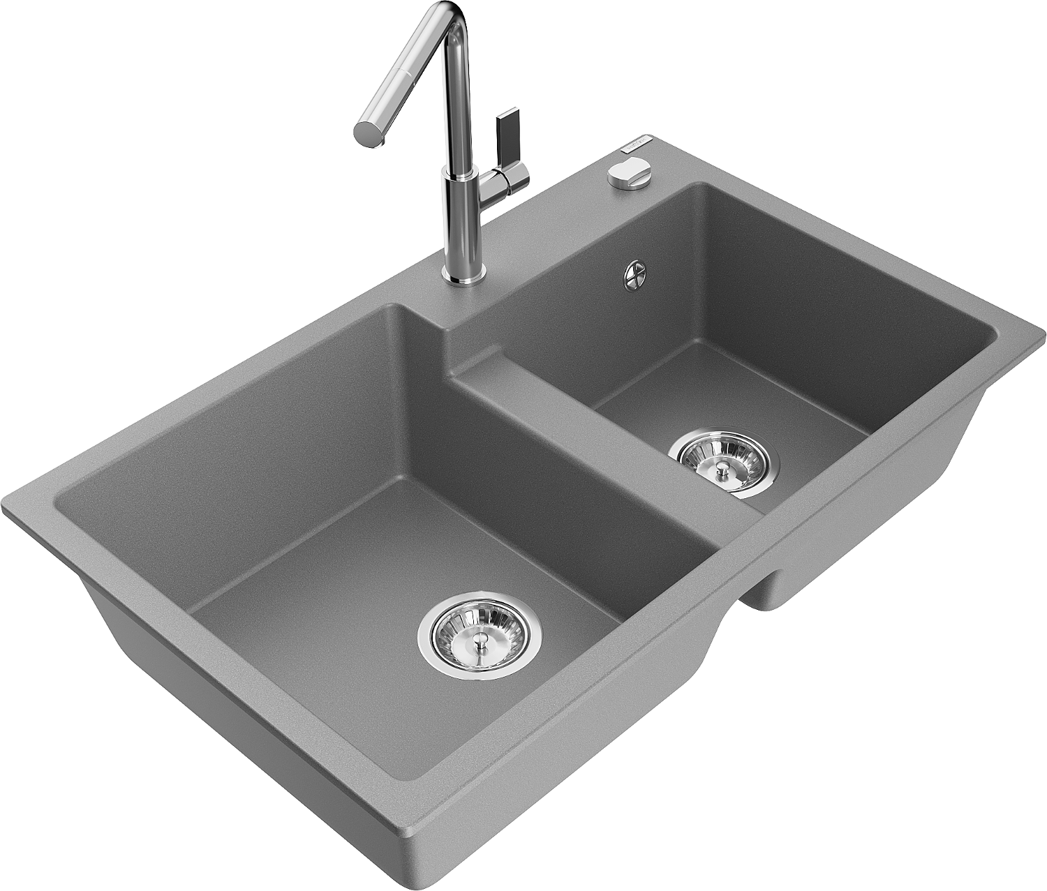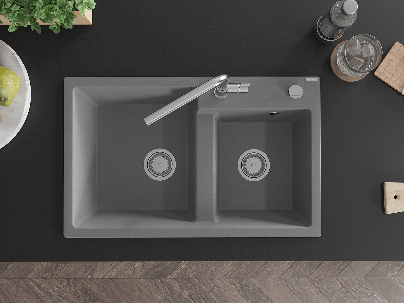 Mexen Tomas gránit mosogató 2 rekeszes konyhai csappal Flora, szürke - 6516-71-670401-00