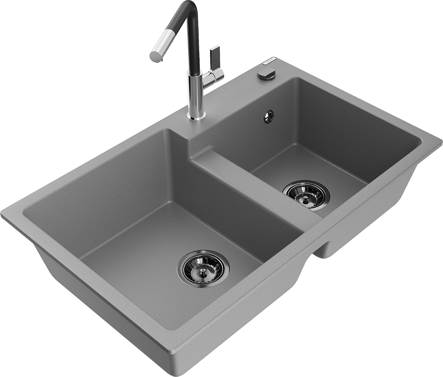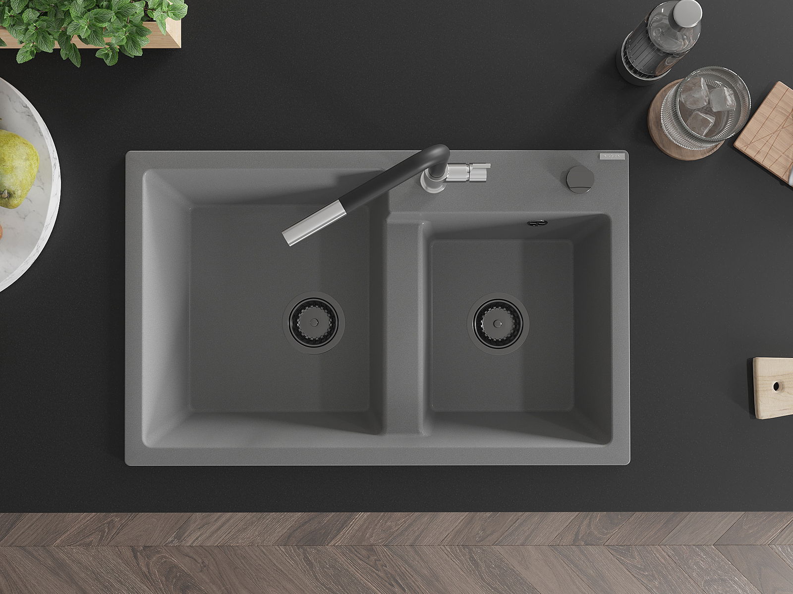 Mexen Tomas gránitkonyhai mosogató, 2-medencés, Flora konyhai csappal, szürke - 6516-71-670401-07-B