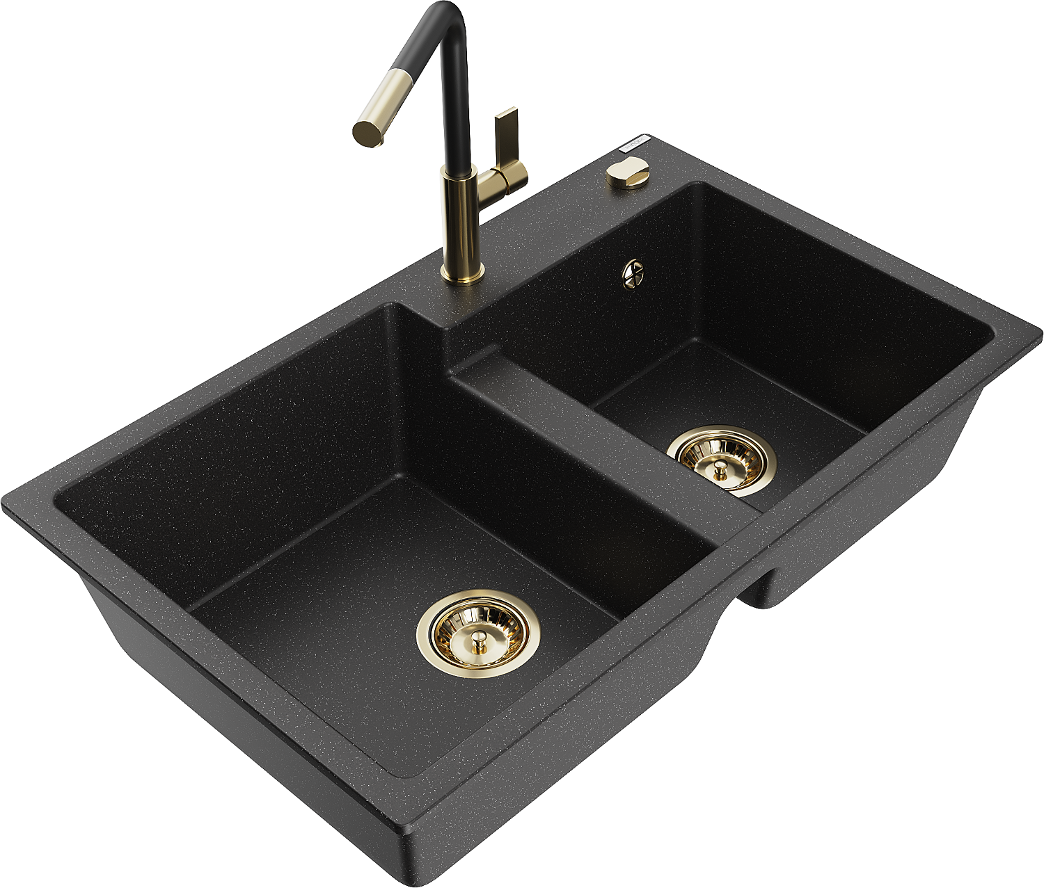 Mexen Tomas gránit mosogató 2 rekeszes konyhai csapteleppel Flora, fekete/ezüst metál - 6516-73-670401-57-G