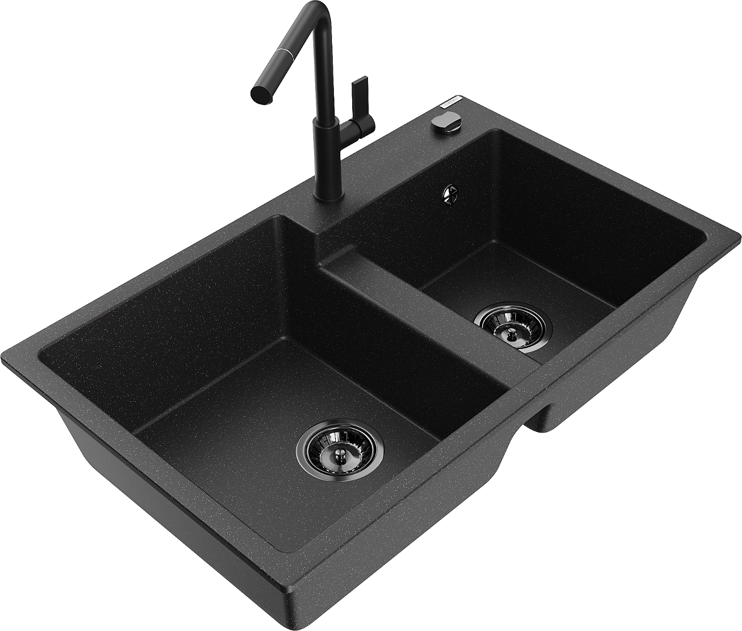 Mexen Tomas 2 kamrás gránit mosogató Flora konyhai csapteleppel, fekete/ezüst metál - 6516-73-670401-70-B
