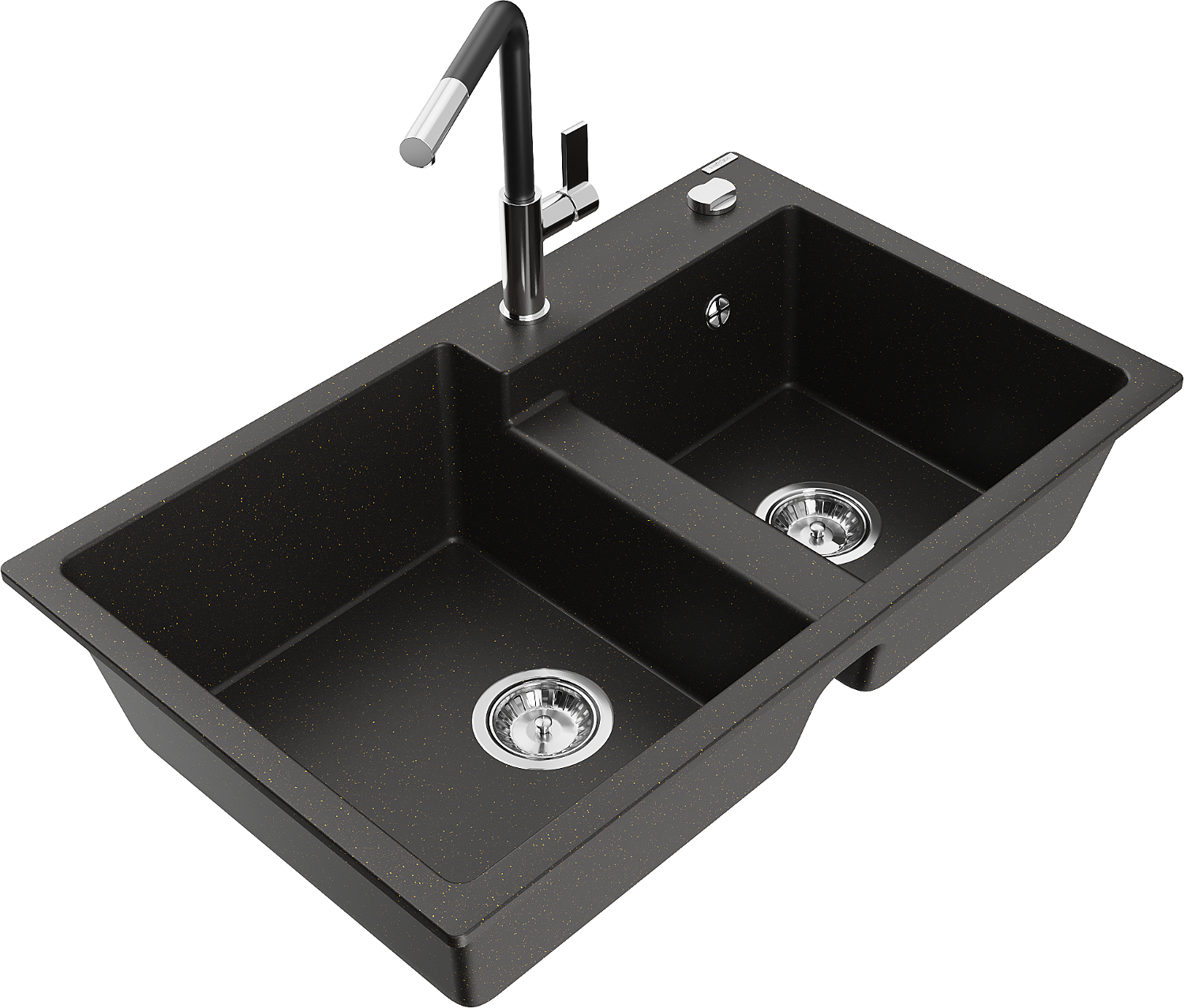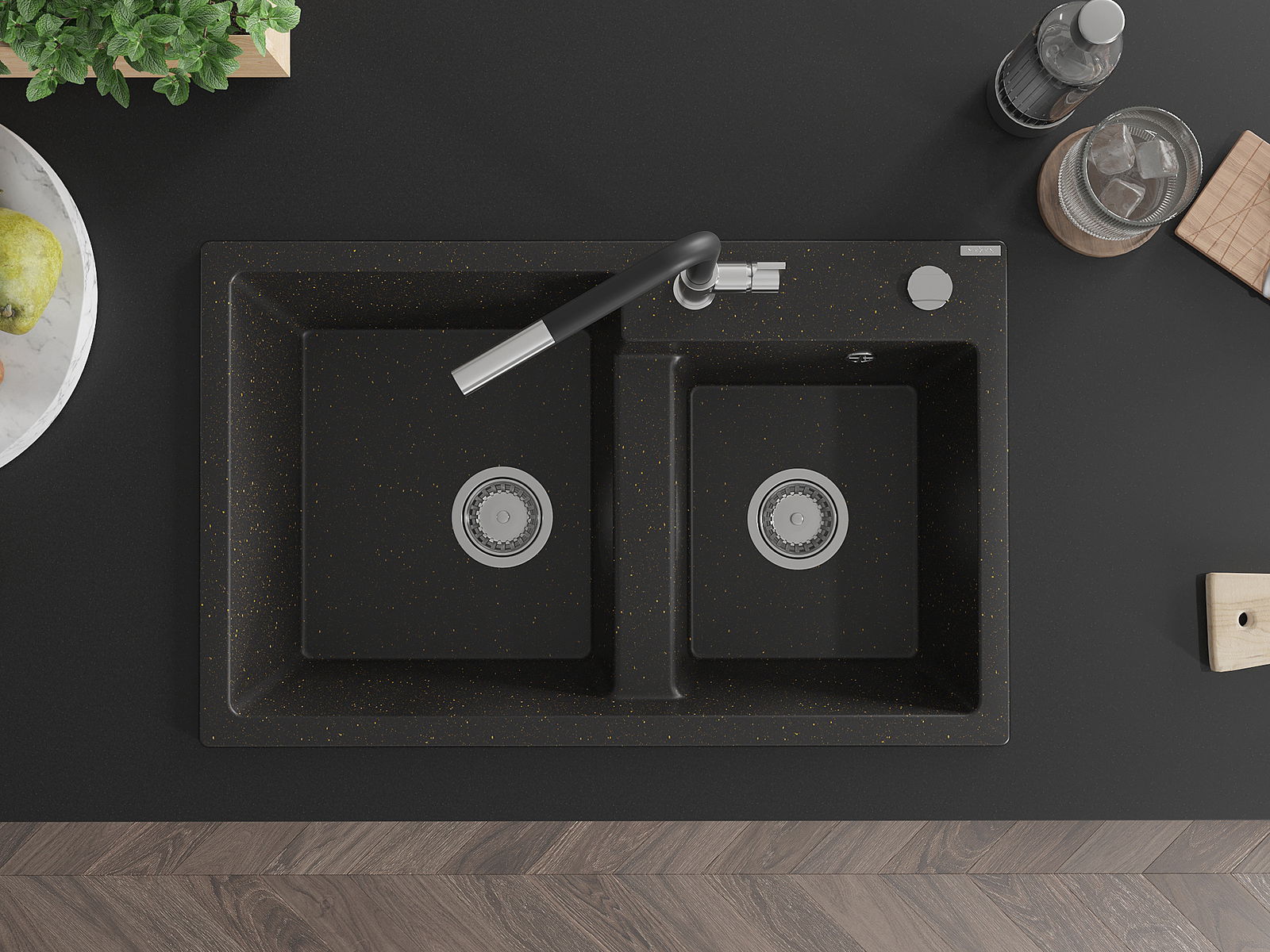 Mexen Tomas gránit mosogató 2-medencés konyhai csappal Flora, fekete/arany metál - 6516-75-670401-07