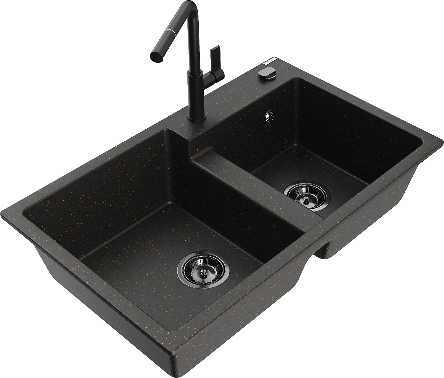 Mexen Tomas gránit 2-kamrás mosogató Flora konyhai csapteleppel, fekete/arany metál - 6516-75-670401-70-B