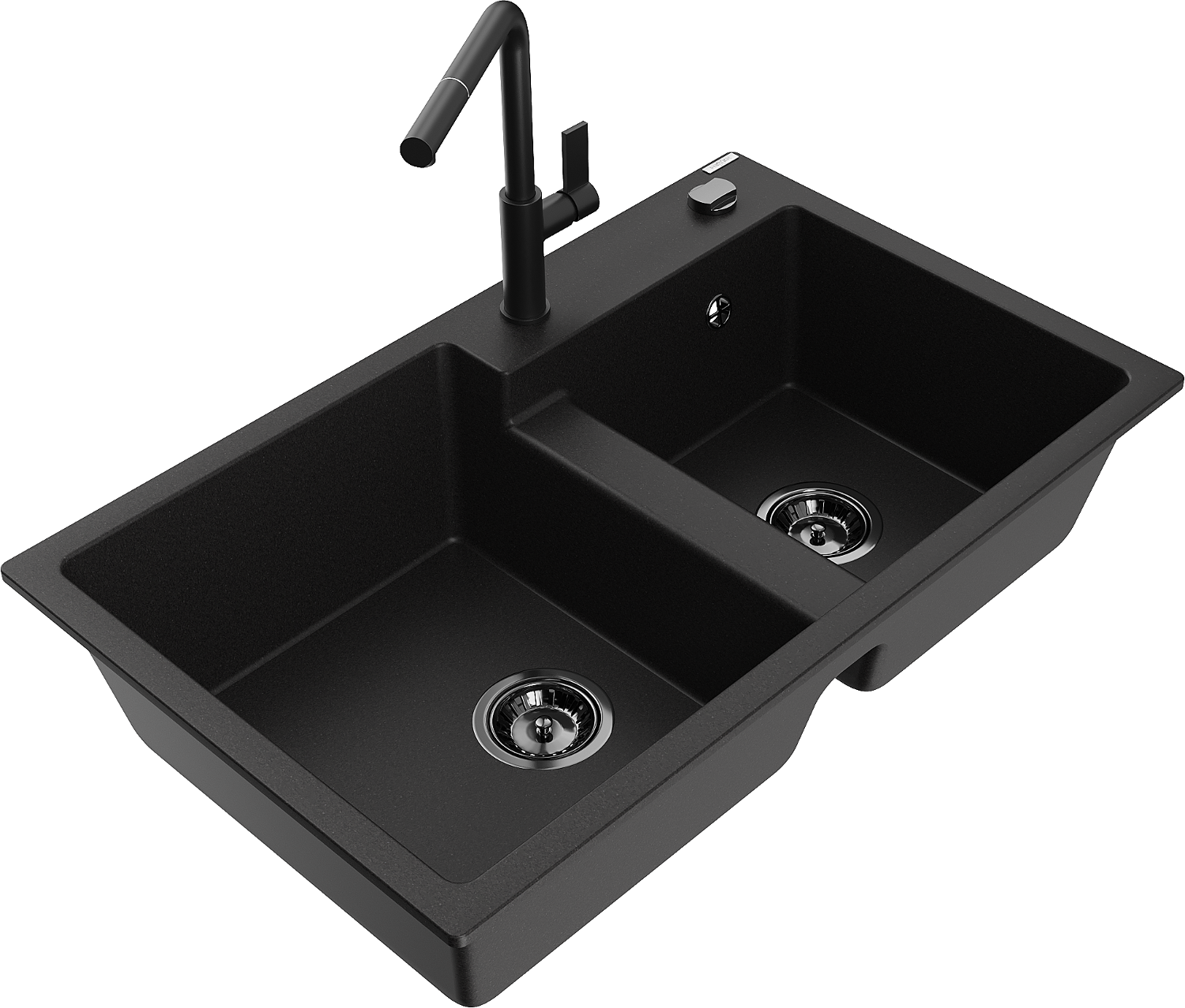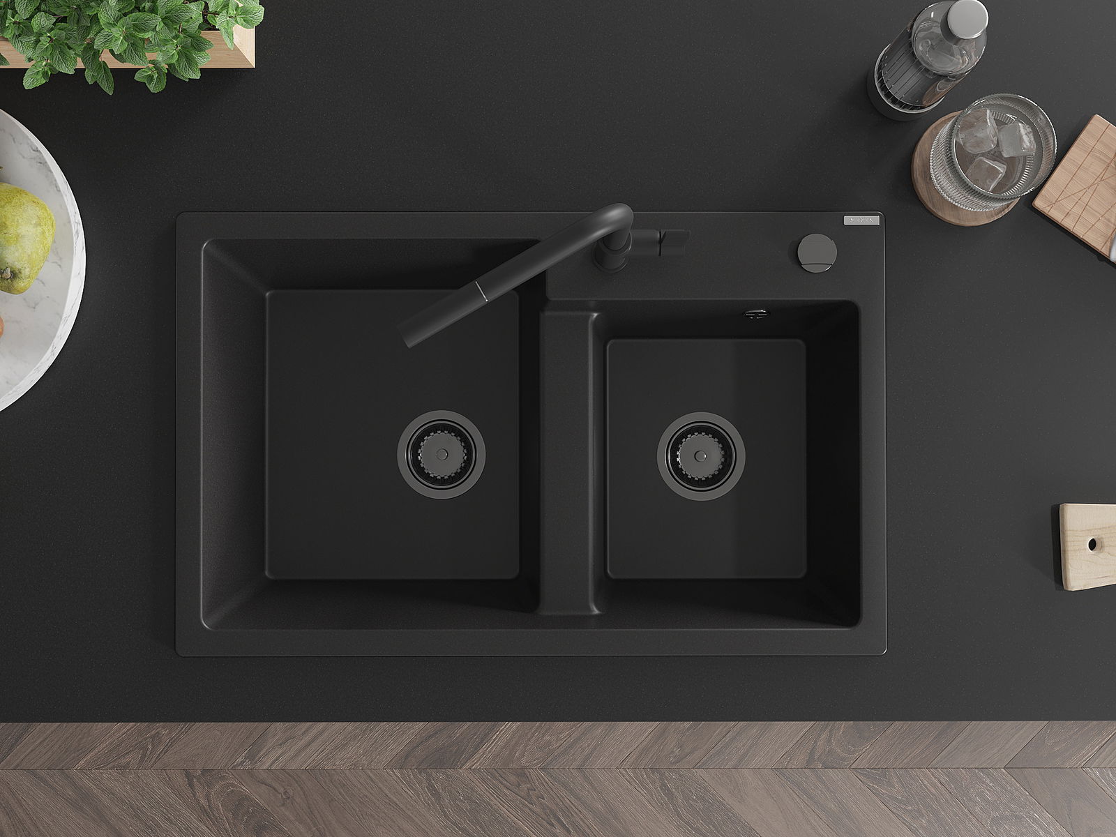 Mexen Tomas 2 rekeszes gránit mosogató Flora konyhai csapteleppel, fekete - 6516-77-670401-70-B