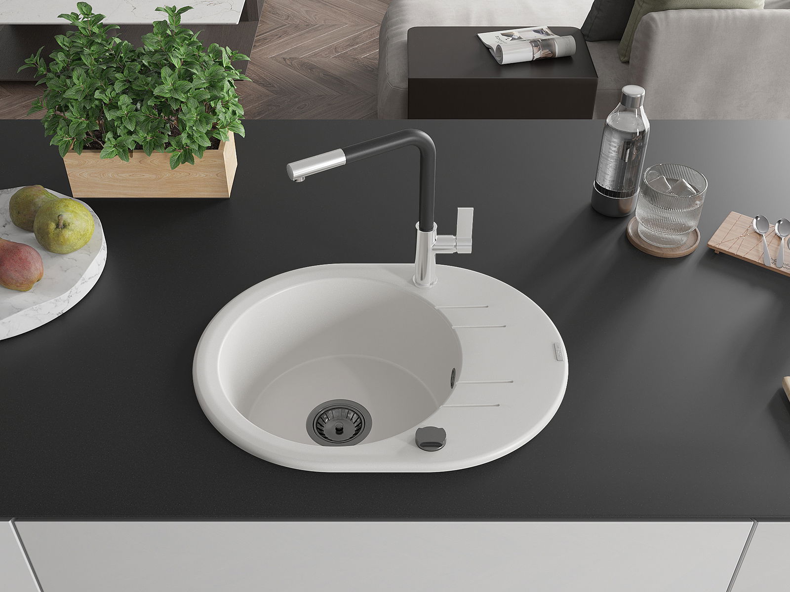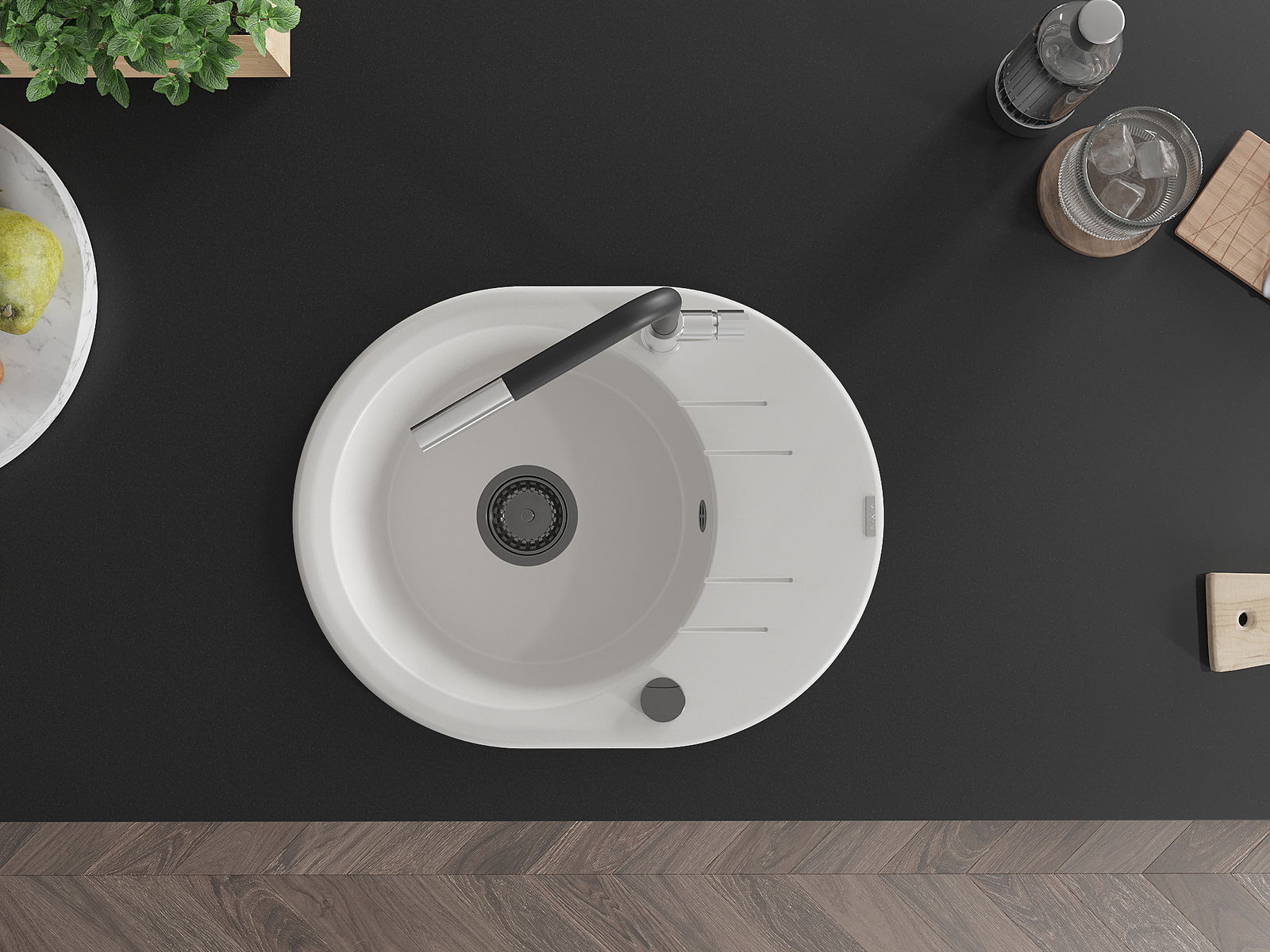 A mosogató magas minőségű gránitból készült. Elegáns, de mindenekelőtt praktikus kiegészítője minden konyhának, függetlenül annak stílusától. A gránit magas minősége és tartóssága hosszú távú használatot biztosít.