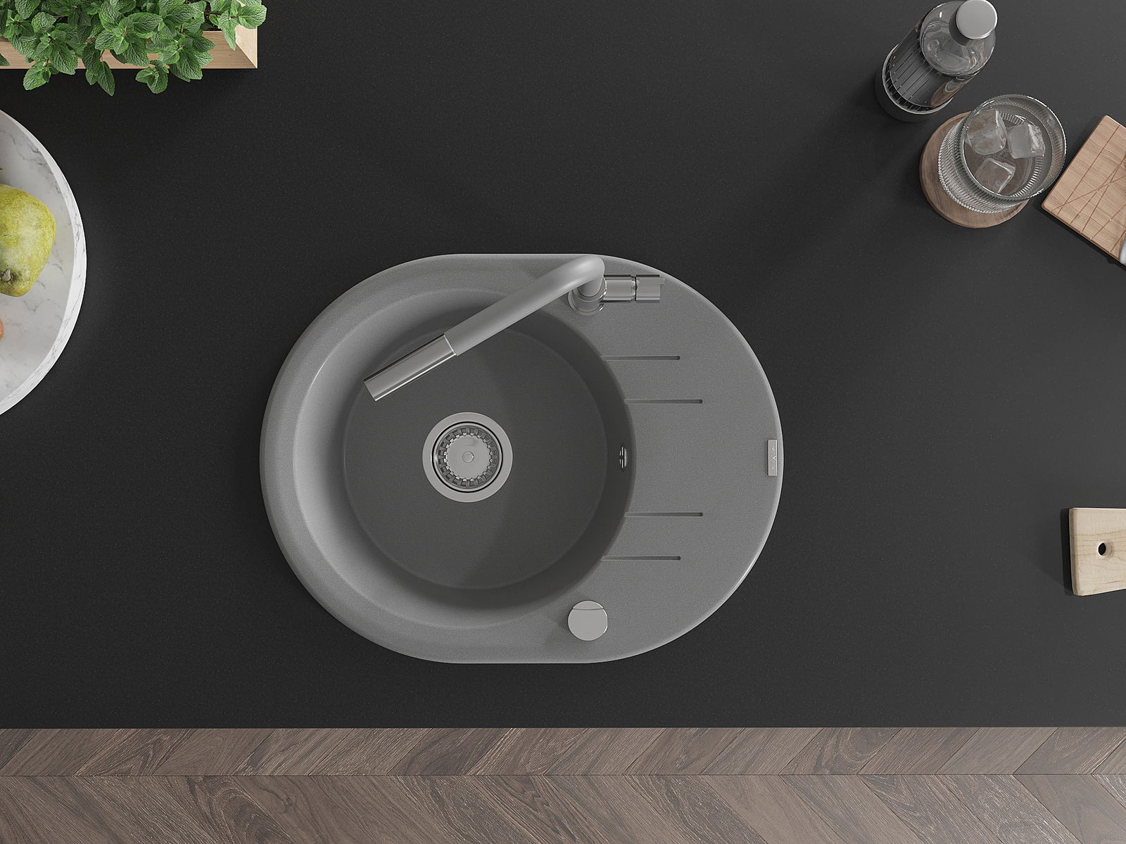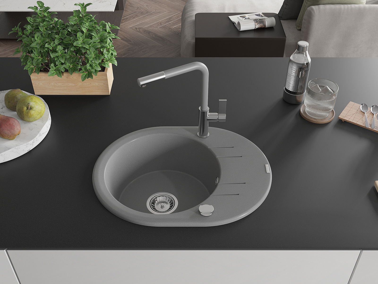 A mosogató kiváló minőségű gránitból készül. Ez egy elegáns és mindenekelőtt minden konyhához praktikus kiegészítés, stílusától függetlenül. A kiváló minőségű és a gránit tartósság biztosítja a sok éves használatát.