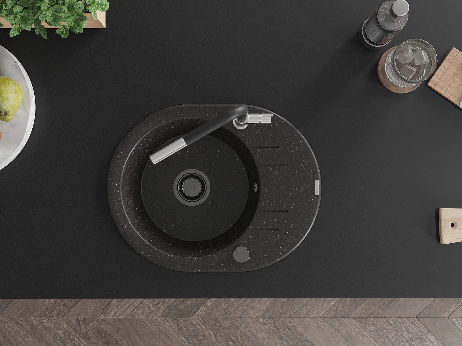 Mexen Kevin gránit mosogató 1-medencés csepegtetővel és Flora konyhai csapteleppel, fekete/arany metál - 6517-75-670401-07-B