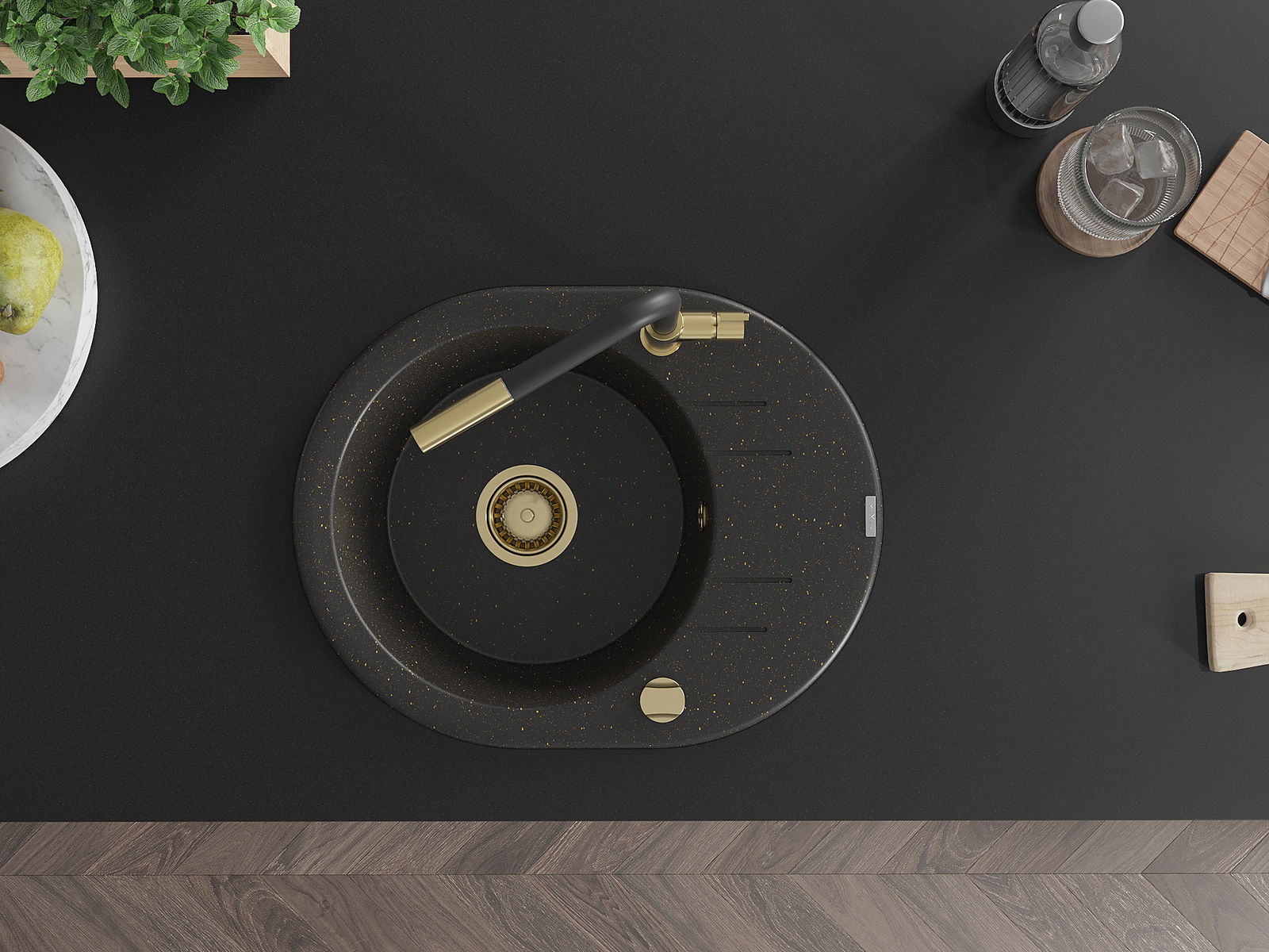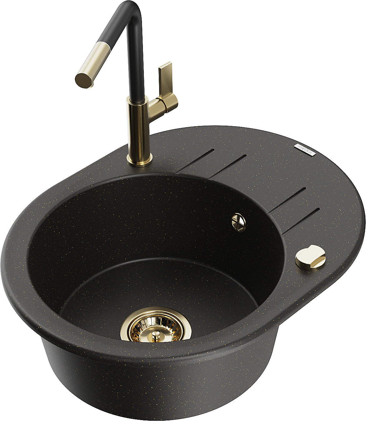 Mexen Kevin 1-medencés gránit mosogató csepegtetővel és Flora konyhai csappal, fekete/arany metál - 6517-75-670401-57-G