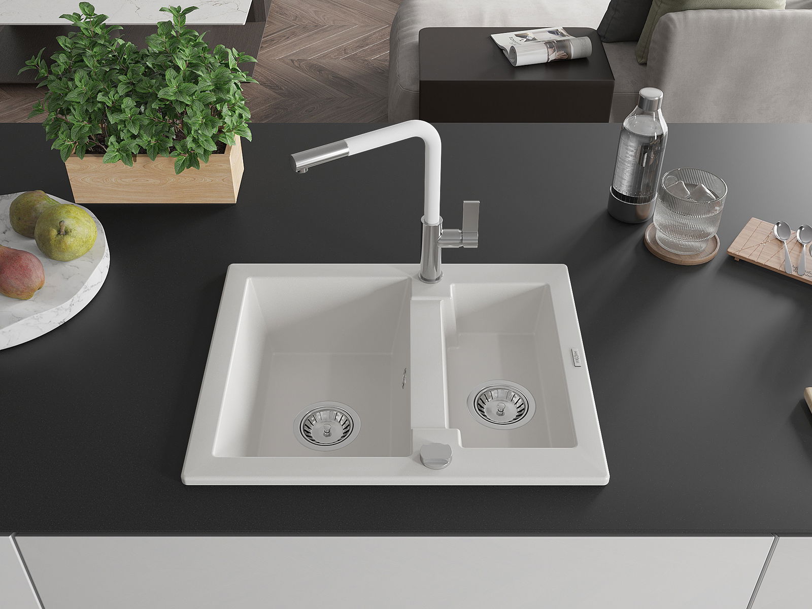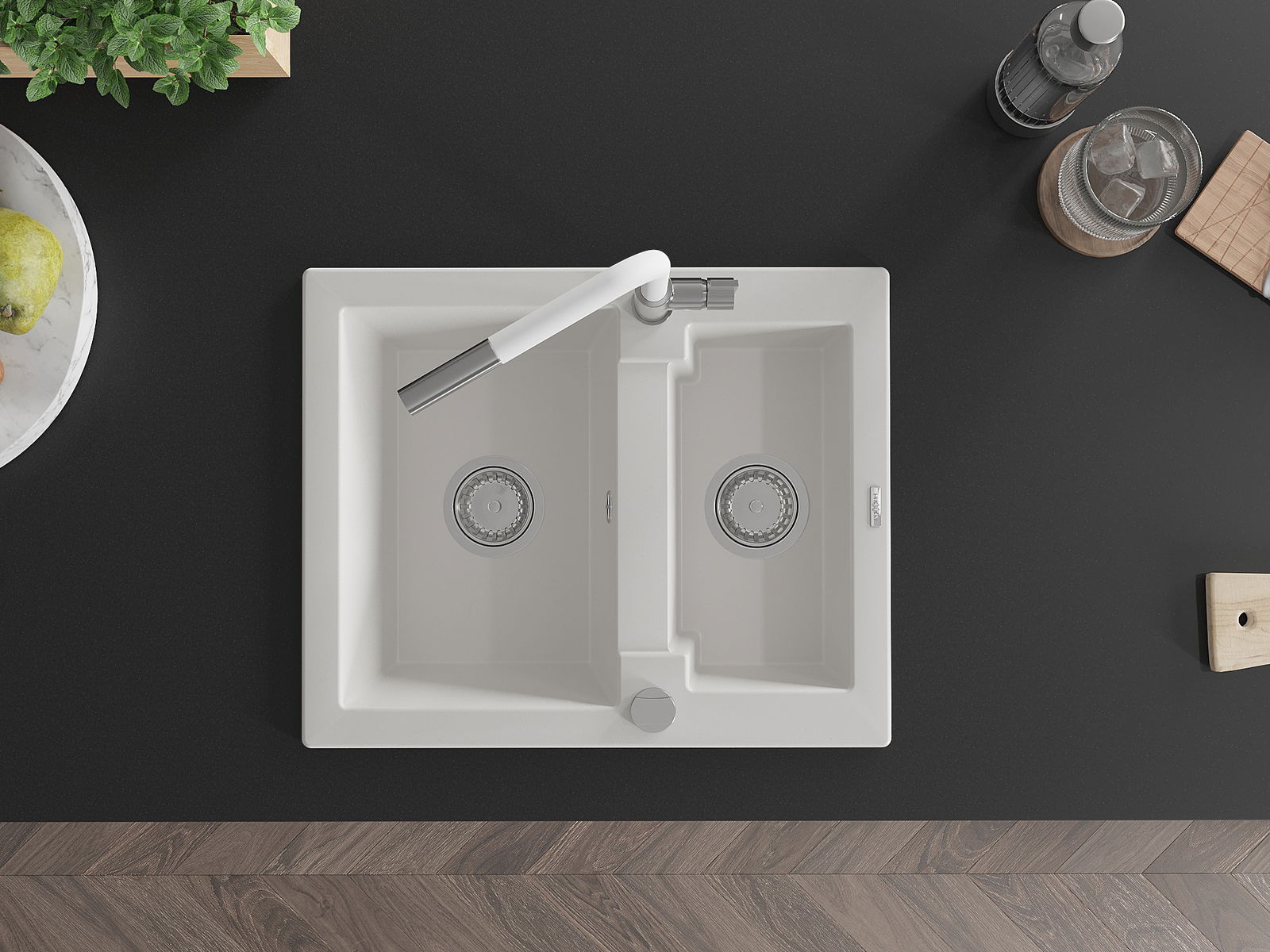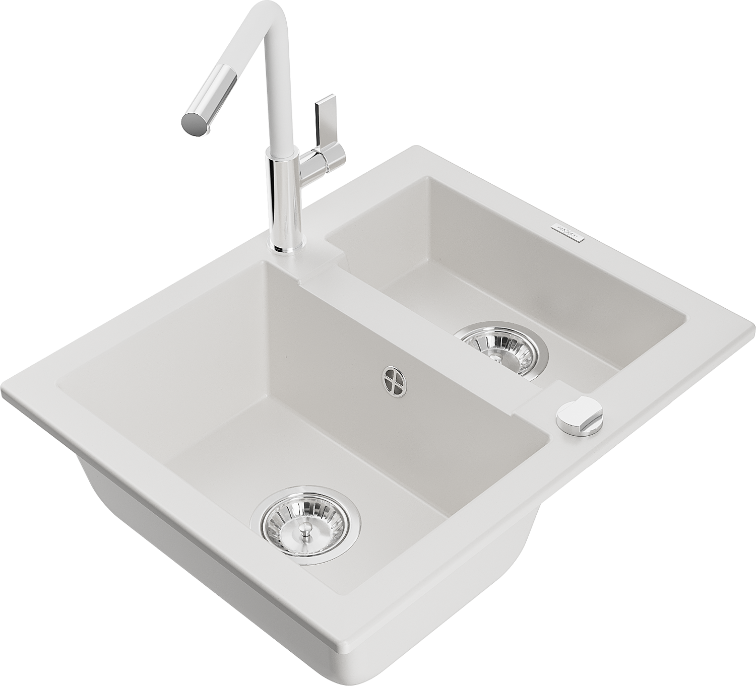 Mexen Carlos 1,5-medencés gránit mosogató Flora konyhai csapteleppel, fehér - 6518-20-670401-02