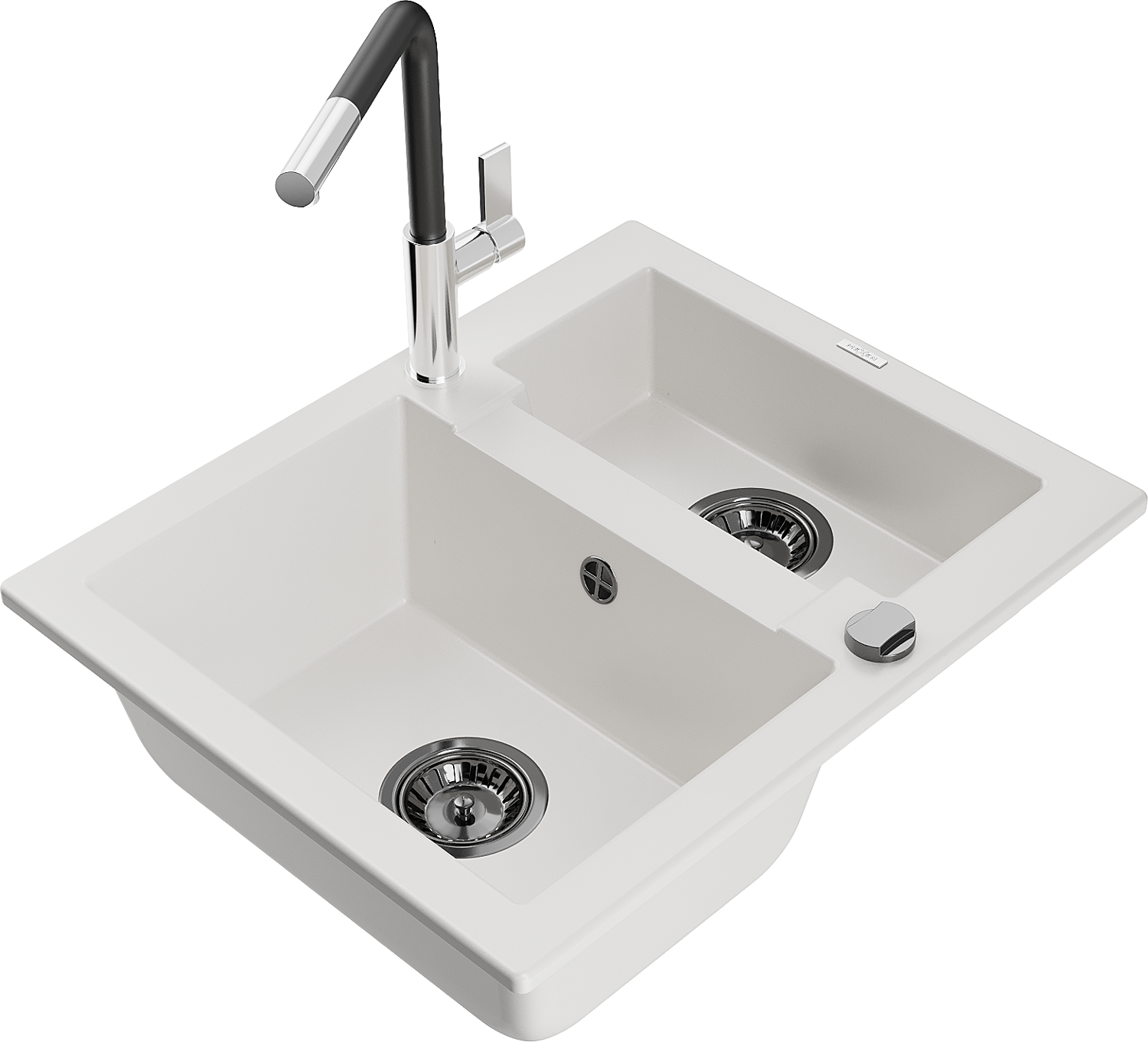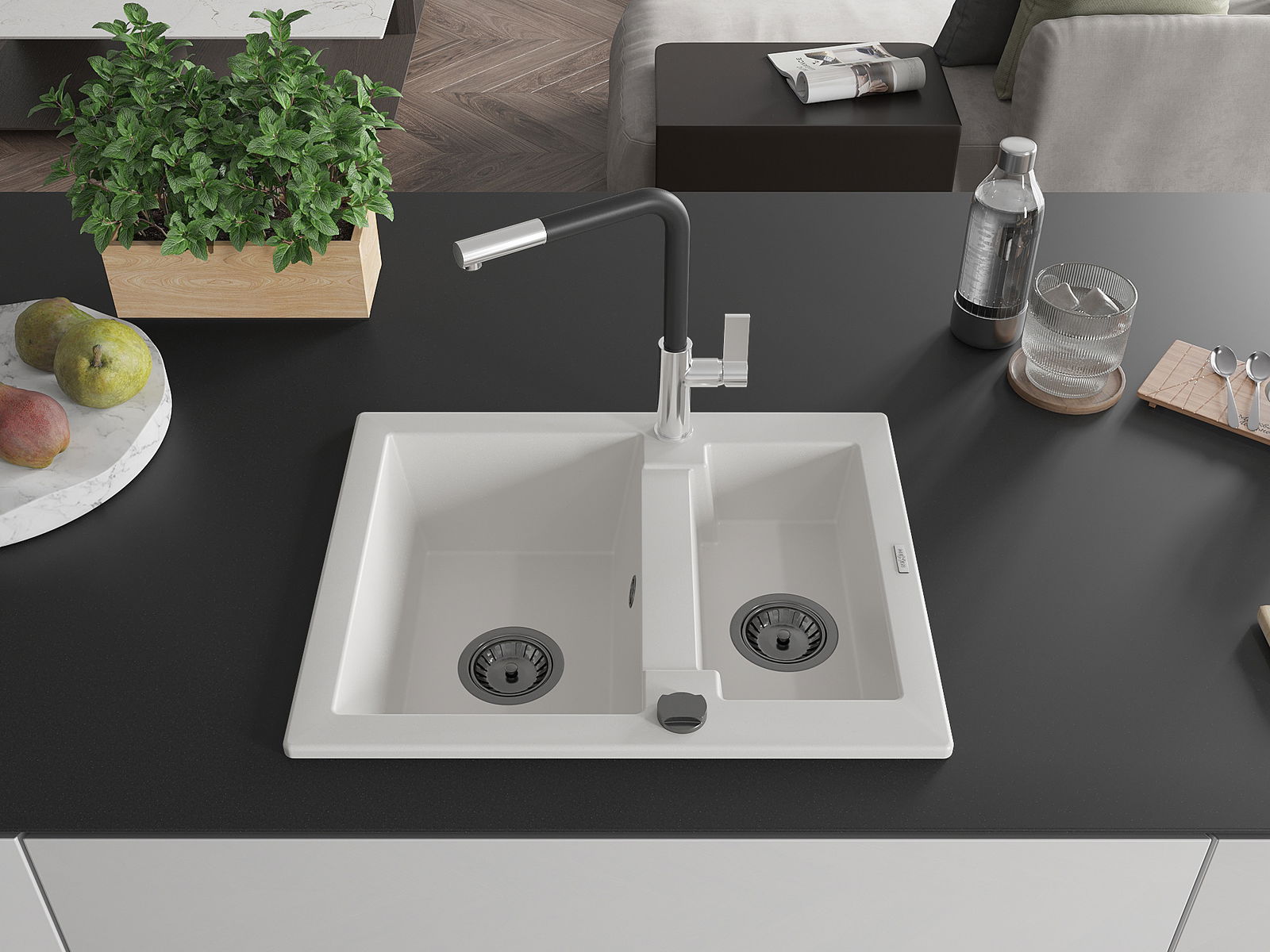 Mexen Carlos 1,5-medencés gránit mosogató Flora konyhai csapteleppel, fehér - 6518-20-670401-07-B