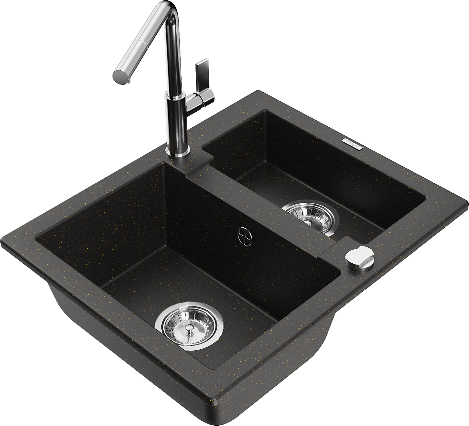 Mexen Carlos gránitmosogató 1,5-medencés Flora konyhai csapteleppel, fekete/arany metál - 6518-75-670401-00
