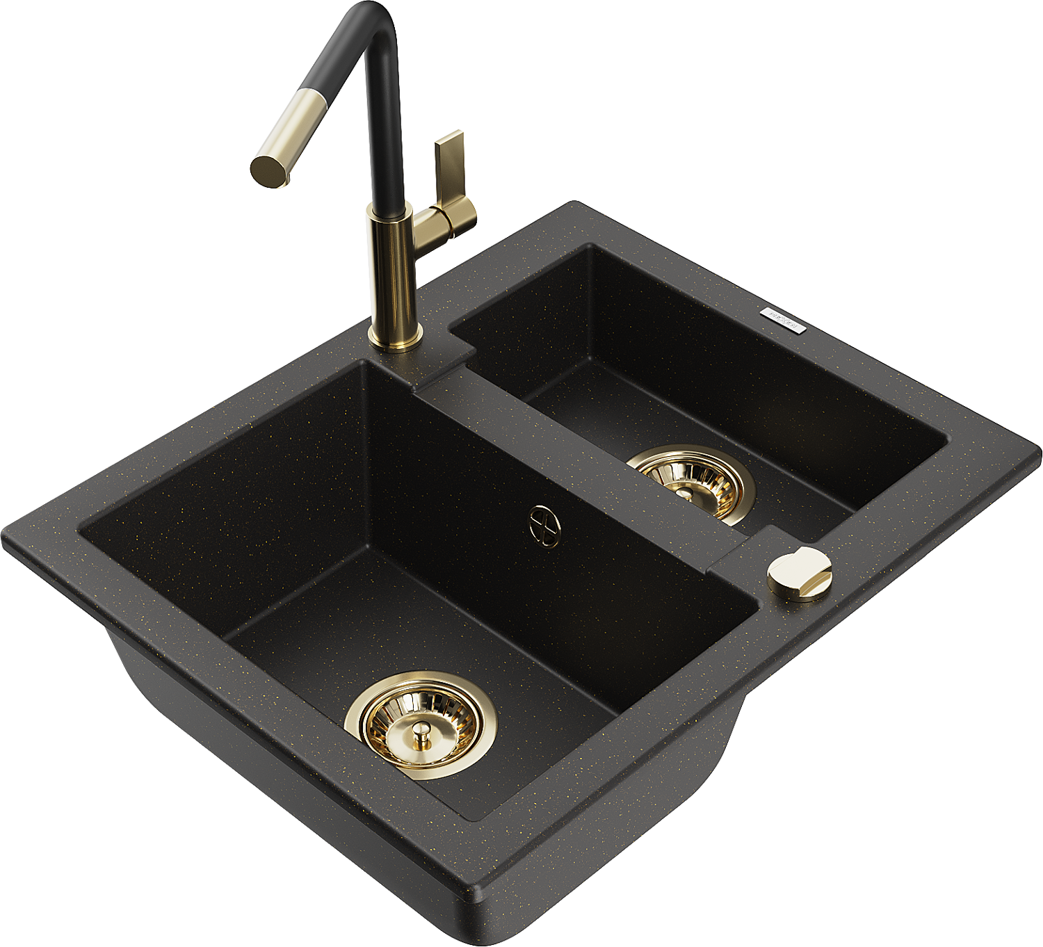 Mexen Carlos gránit mosogató 1,5 tálcás konyhai Flora csappal, fekete/arany metál - 6518-75-670401-57-G
