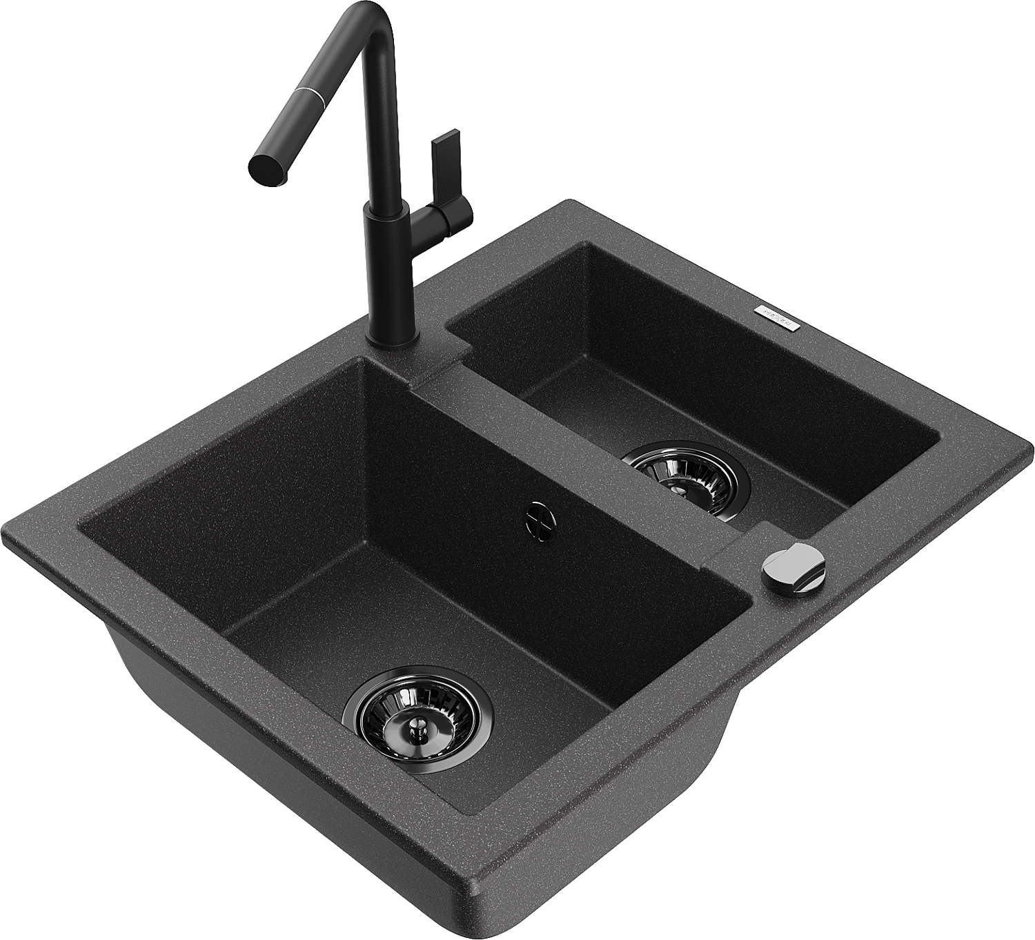 Mexen Carlos 1,5-medencés gránit mosogató Flora konyhai csapteleppel, fekete pöttyös - 6518-76-670401-70-B
