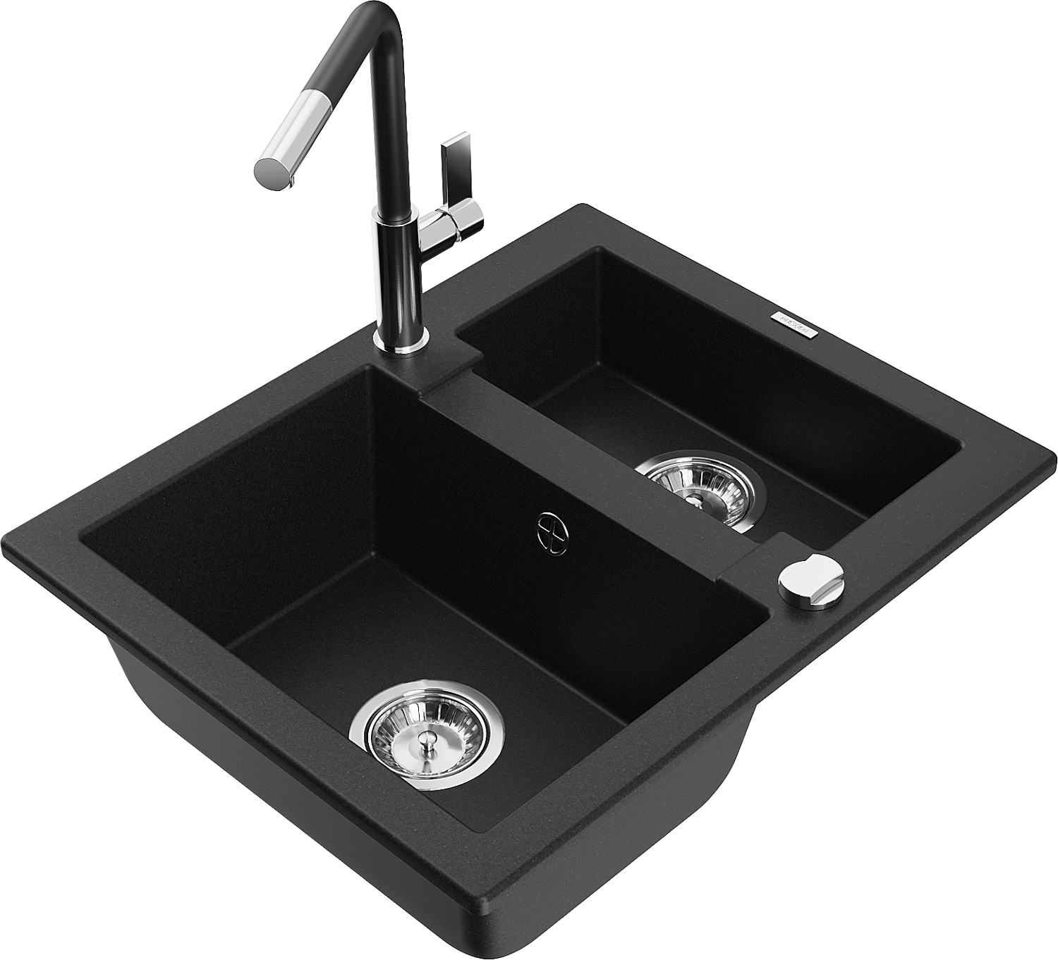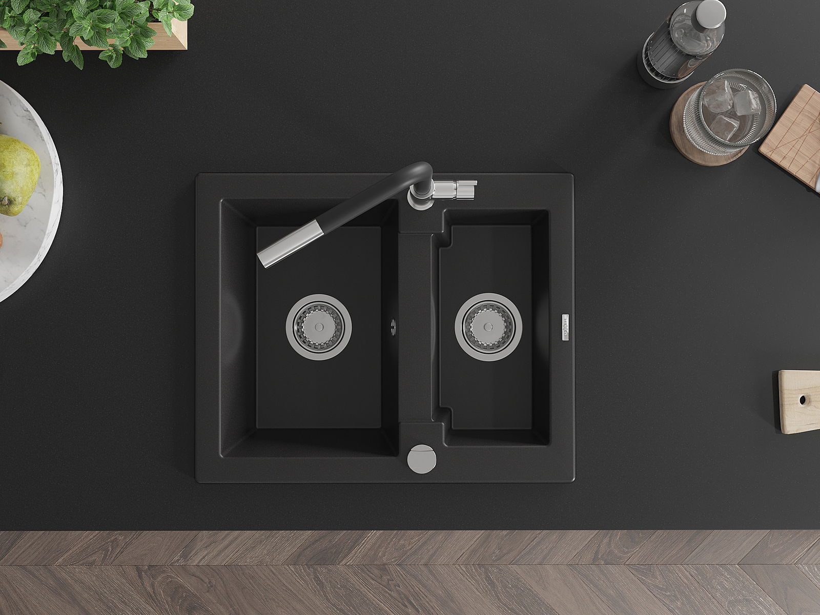 Mexen Carlos 1,5 kamrás gránit mosogató Flora konyhai csappal, fekete - 6518-77-670401-07