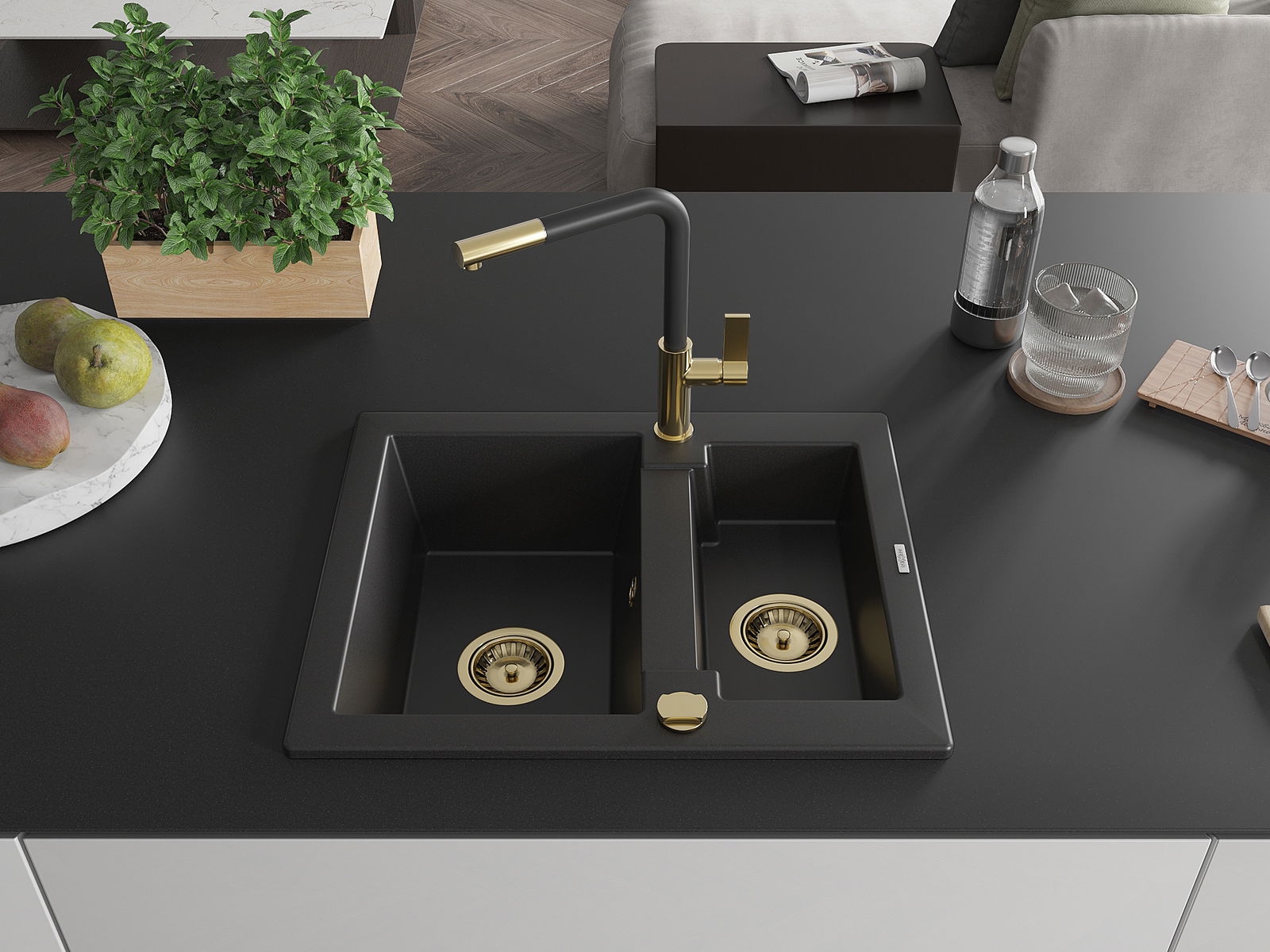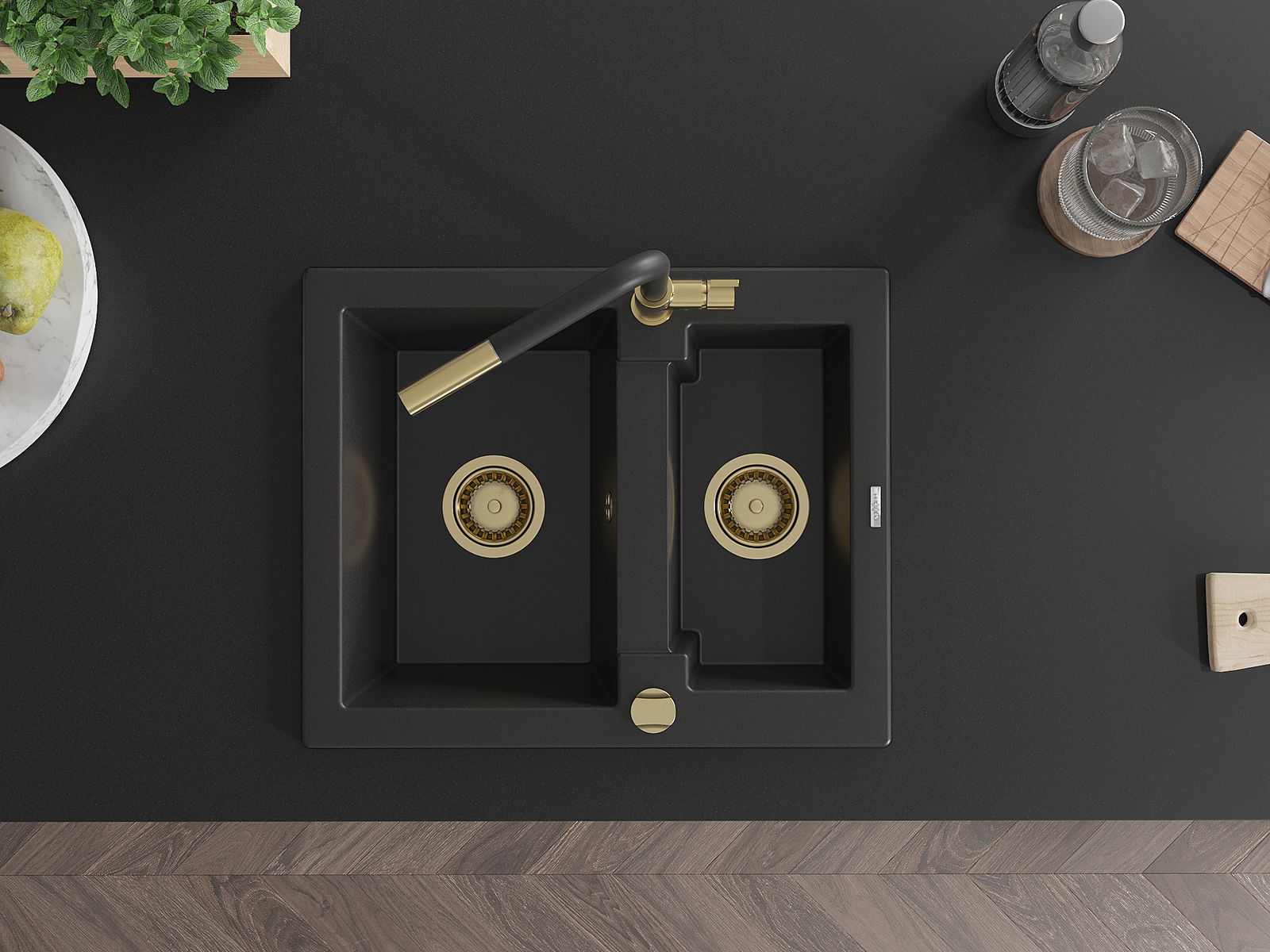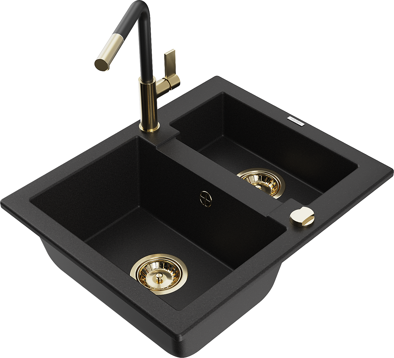 Mexen Carlos gránit mosogató 1,5 kamrával Flora konyhai csapteleppel, fekete - 6518-77-670401-57-G