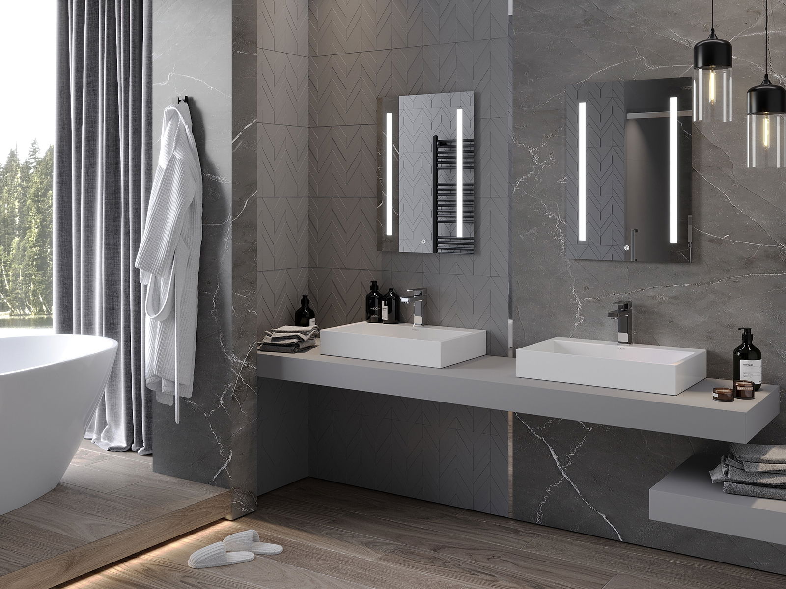 A LED -es háttérvilágítás a tükörnél egy gyakorlati elem, amely megkönnyíti a napi ellátást, az ideális arcvilágítás lehetőségének köszönhetően. A háttérvilágítás modern felületet ad a fürdőszobának, hangsúlyozva elegáns dekorációját.