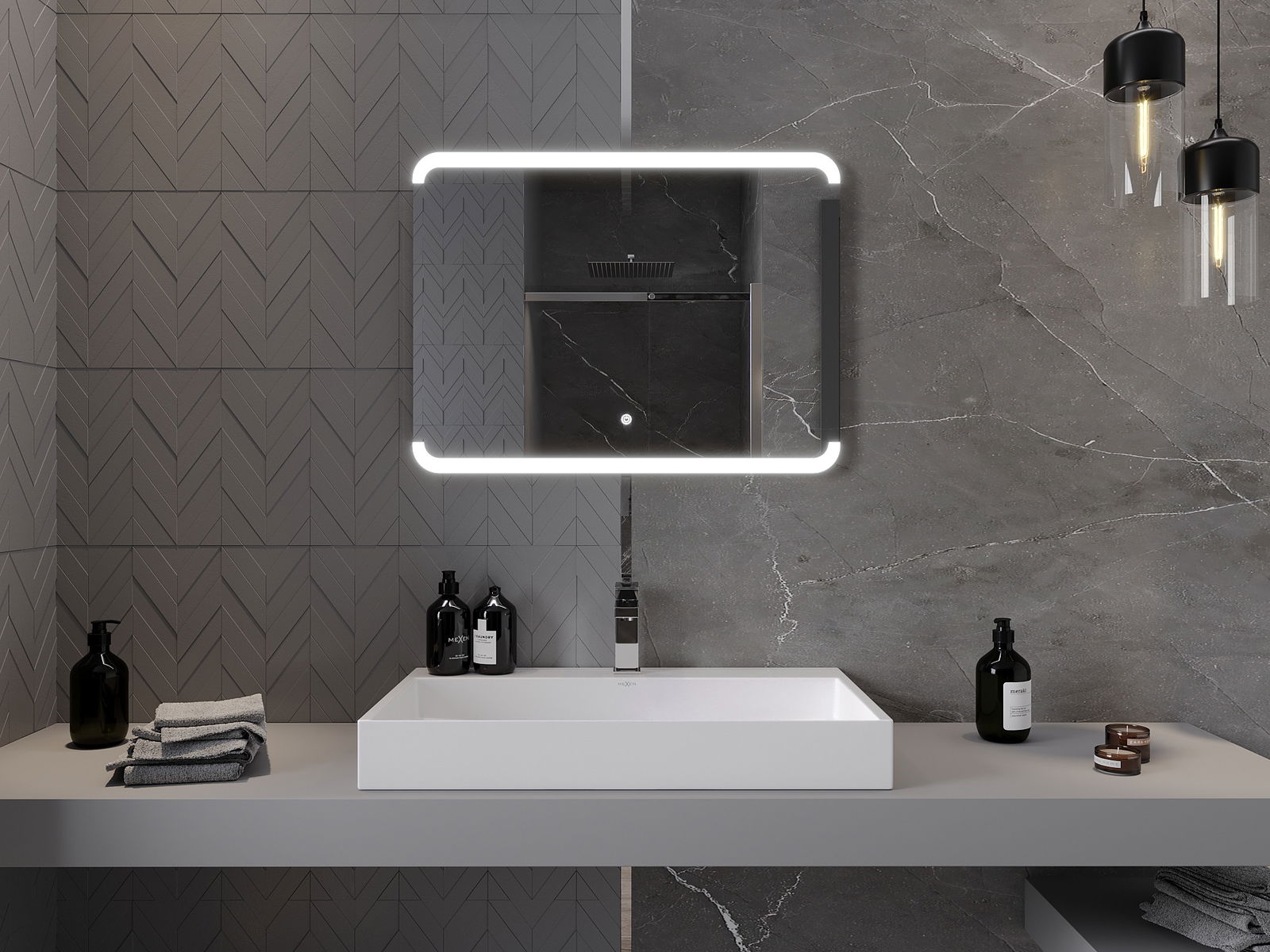 A tükörvilágítás egyszerűen és kényelmes módon indítható a tükör felületén lévő kapcsoló megérintésével. Ez lehetővé teszi a gyors megvilágítást, anélkül, hogy el kellene érnie a további hagyományos világítási kapcsolót.