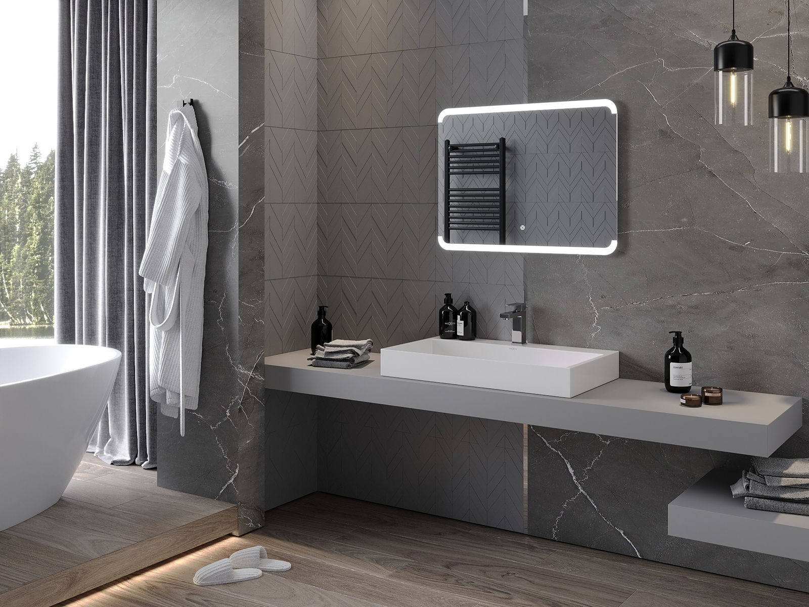 A LED -es háttérvilágítás a tükörnél egy gyakorlati elem, amely megkönnyíti a napi ellátást, az ideális arcvilágítás lehetőségének köszönhetően. A háttérvilágítás modern felületet ad a fürdőszobának, hangsúlyozva elegáns dekorációját.