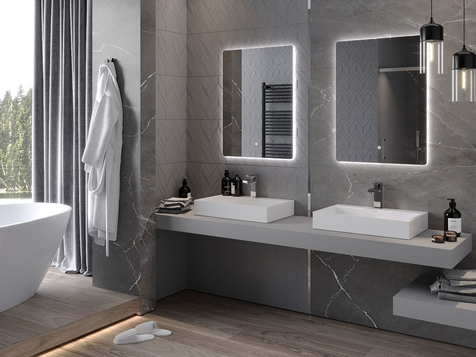 A LED -es háttérvilágítás a tükörnél egy gyakorlati elem, amely megkönnyíti a napi ellátást, az ideális arcvilágítás lehetőségének köszönhetően. A háttérvilágítás modern felületet ad a fürdőszobának, hangsúlyozva elegáns dekorációját.