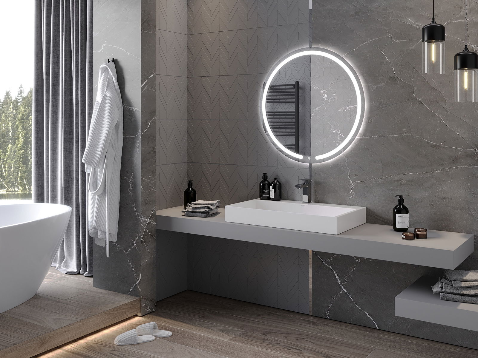 A tükörvilágítás egyszerűen és kényelmes módon indítható a tükör felületén lévő kapcsoló megérintésével. Ez lehetővé teszi a gyors megvilágítást, anélkül, hogy el kellene érnie a további hagyományos világítási kapcsolót.