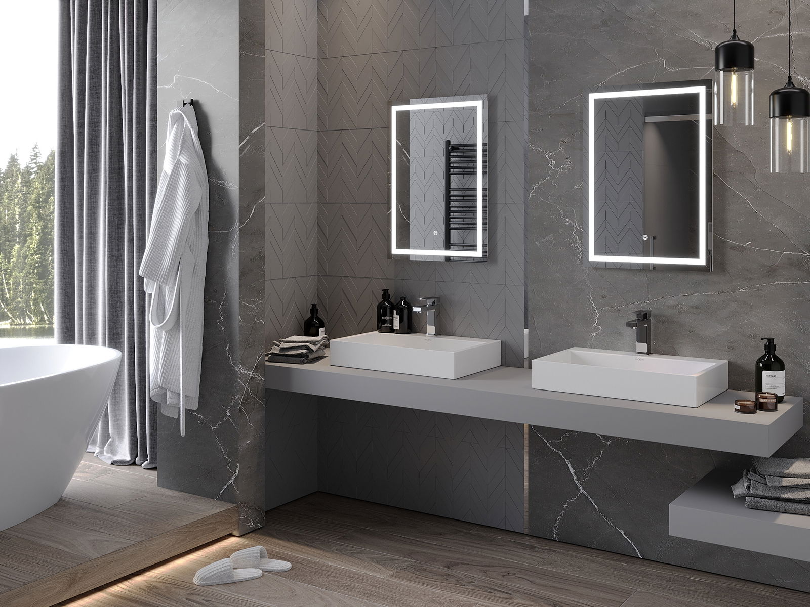 A LED -es háttérvilágítás a tükörnél egy gyakorlati elem, amely megkönnyíti a napi ellátást, az ideális arcvilágítás lehetőségének köszönhetően. A háttérvilágítás modern felületet ad a fürdőszobának, hangsúlyozva elegáns dekorációját.