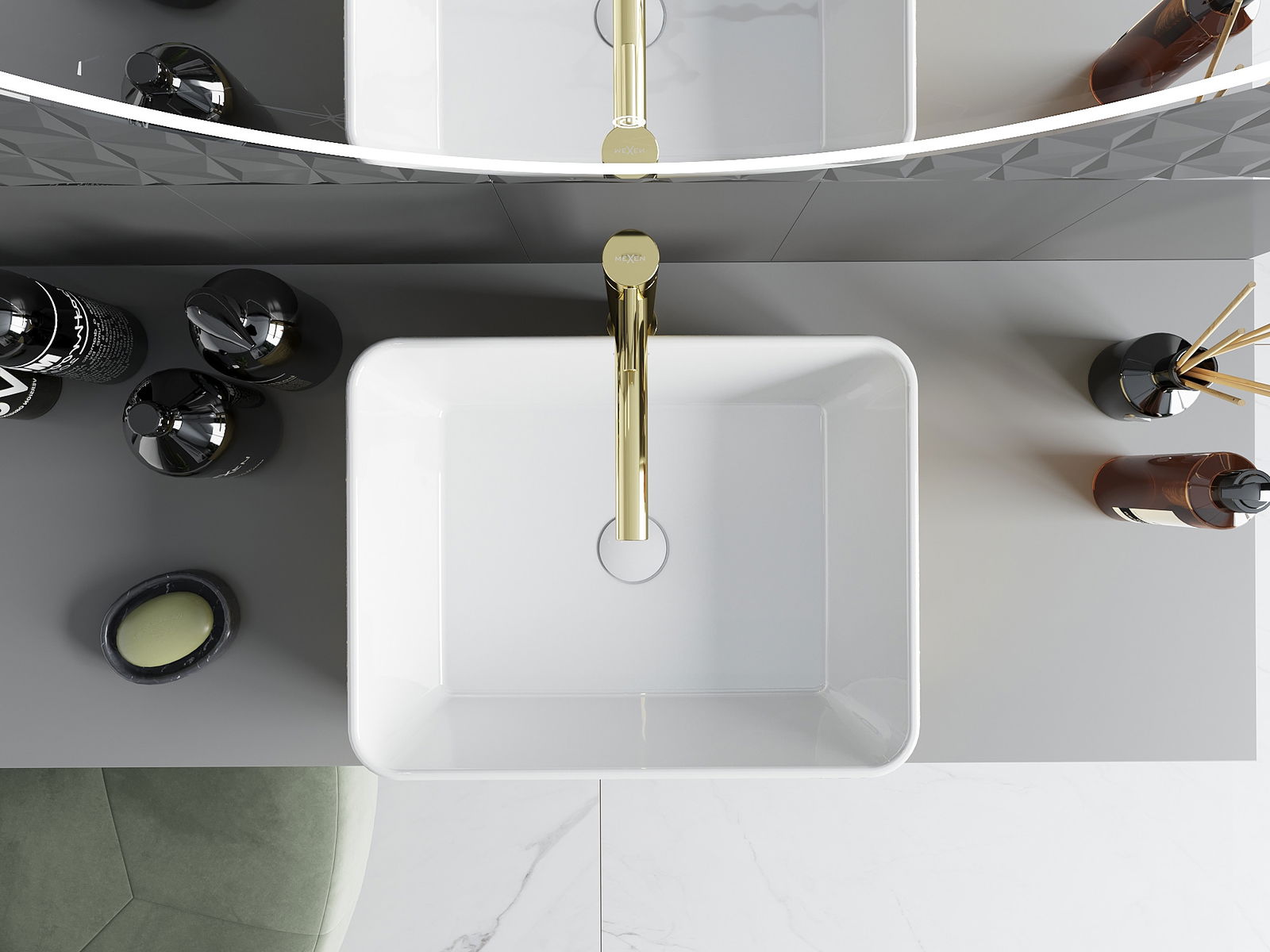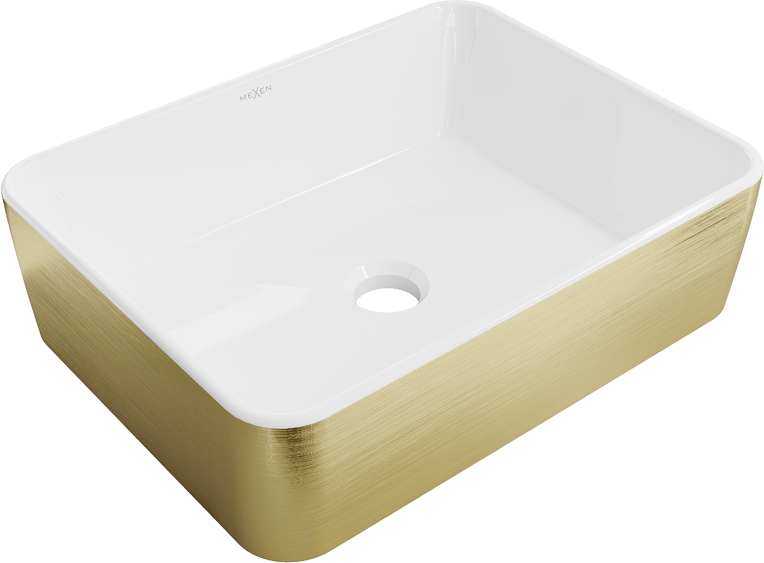 A Mexen Catia egy elegáns pultra szerelhető mosdókagyló 48 x 38 cm-es méretben, fehér és arany színben, kiválóan alkalmas modern fürdőszobákhoz. Magas minőségű szaniter kerámiából készült, téglalap alakja és matt felülete különleges varázst kölcsönöz neki. A csaptelep és a túlfolyó nyílások hiánya minimalista designt biztosít, a további védőréteg pedig növeli a tartósságát. Ideális luxus vagy skandináv stílusú belső terek befejezéséhez.