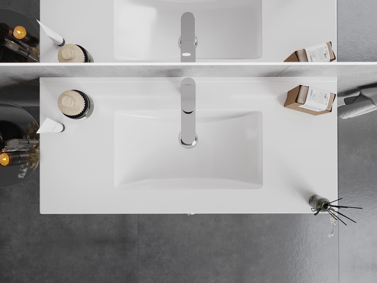A mosogatónak van egy lyuk, amelybe fel tudjuk szerelni az akkumulátort. Ez értékes helyet takarít meg a fürdőszobában, és hangsúlyozza annak esztétikáját. Ez a megoldás lehetővé teszi, hogy könnyen tisztán tartsa a mosogatót.